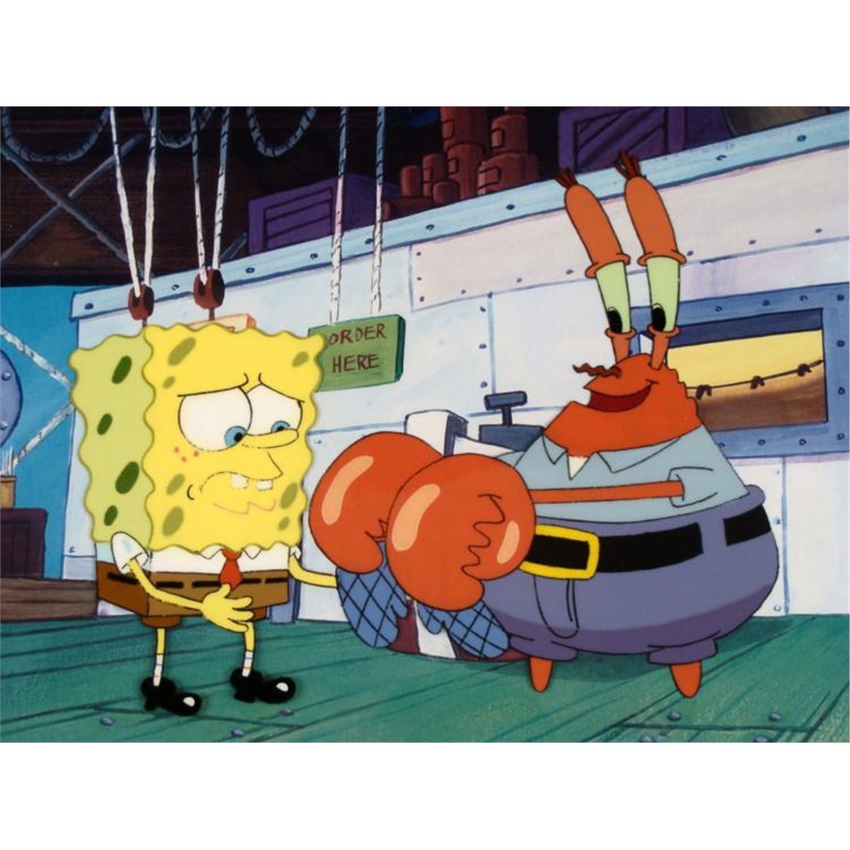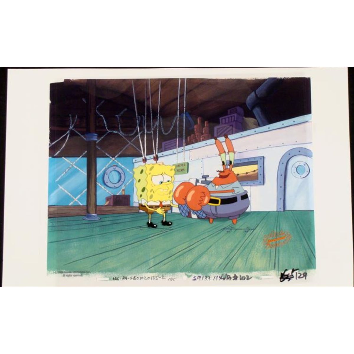* This animation cel and reproduction background are from the Nickelodeon TV show SpongeBob Squarepants. The story takes place under the deep blue sea in Bikini Bottom, where SpongeBob resides. SpongeBob, who is a yellow, porous sponge, is your typical happy-go-lucky character, as he is always cheerful and enjoys making people laugh. Patrick Star, SpongeBob's neighbor who is a starfish, is your average children's show idiot, as he boasts knowing nothing and is often getting himself into ridiculous situations.Between the homes of these two lies the home of the miserable Squidward, a squid, who is known for being grouchy and playing tricks on SpongeBob and Patrick. Both SpongeBob and Squidward work at the Krusty Krab, a fast food business run by the greedy money-loving Mr. Krabs, a crab, the arch rival of the evil, possibly misunderstood, Plankton. Another neighbor, Sandy Cheeks, an athletic squirrel who normally wears an astronaut's space suit, was introduced in "Tea at the Treedome." She spends most of her time inventing and experimenting. * * Seriously?!?!? Do I really need to wear these ridiculous gloves?? * * Original Printed Background and Animated Cel Overall Size of Background: 11" x 17" Overall Size of the Cel: 10 1/2" x 12 1/2" Very good condition This is an original hand-painted cel set-up used in the production of an episode of "SpongeBob SquarePants," titled Squeaky Boots. Each one-of-a-kind set-up represents a slight change in position of the characters. When individually photographed and projected in rapid succession, the images appear to move. * To create production cels, the original animator's drawing is transferred onto an acetate cel (by hand-inking and/or photo copying). The cel is then hand-painted on the reverse side. The background accompanying this set-up is a reproduction background. * * * The printed background and cel are ready to be matted and framed. The notations are located at the bottom of both. The cel is multi-layered: first is Spongebob and then is Mr. Krabs. The Nickelodeon logo is located at the bottom right of the first cel. There is some paint fade to Spongebob's outline. *