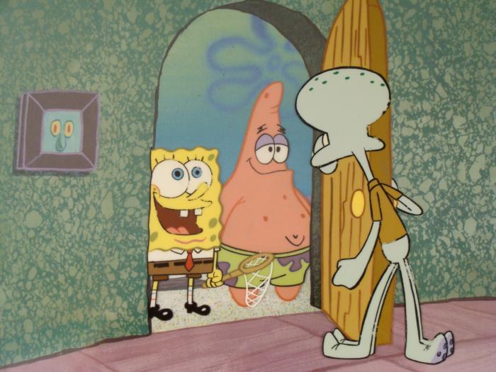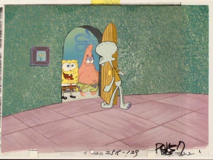 This animation cel and reproduction background are from the Nickelodeon TV show SpongeBob Squarepants. The story takes place under the deep blue sea in Bikini Bottom, where SpongeBob resides. SpongeBob, who is a yellow, porous sponge, is your typical happy-go-lucky character, as he is always cheerful and enjoys making people laugh. Patrick Star, SpongeBob's neighbor who is a starfish, is your average children's show idiot, as he boasts knowing nothing and is often getting himself into ridiculous situations. Between the homes of these two lies the home of the miserable Squidward, a squid, who is known for being grouchy and playing tricks on SpongeBob and Patrick. Both SpongeBob and Squidward work at the Krusty Krab, a fast food business run by the greedy money-loving Mr. Krabs, a crab, the arch rival of the evil, possibly misunderstood, Plankton. Another neighbor, Sandy Cheeks, an athletic squirrel who normally wears an astronaut's space suit, was introduced in "Tea at the Treedome." She spends most of her time inventing and experimenting. SpongeBob and Patrick are at Squidward's house.Original Printed Background and Animated Cel Overall Size of Background: 11" x 17" Overall Size of the Cel: 10 1/2" x 12 1/2" Size of the Squidward Cel: 10 1/2" x 16 1/2"Very good condition This is an original hand-painted cel set-up used in the production of an episode of "SpongeBob SquarePants." Each one-of-a-kind set-up represents a slight change in position of the characters. When individually photographed and projected in rapid succession, the images appear to move.