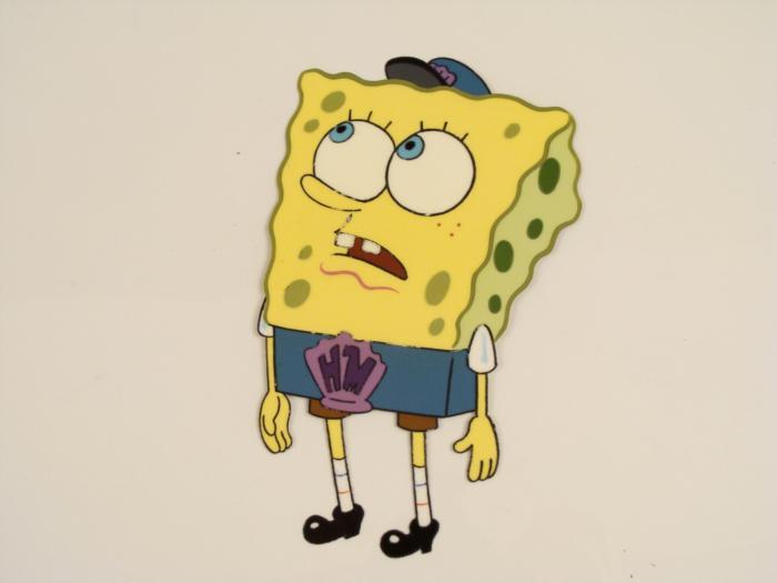This original animation cel is from the Nickelodeon TV show SpongeBob Squarepants. The story takes place under the deep blue sea in Bikini Bottom, where SpongeBob resides. SpongeBob, who is a yellow, porous sponge, is your typical happy-go-lucky character, as he is always cheerful and enjoys making people laugh. Patrick Star, SpongeBob's neighbor who is a starfish, is your average children's show idiot, as he boasts knowing nothing and is often getting himself into ridiculous situations. Between the homes of these two lies the home of the miserable Squidward, a squid, who is known for being grouchy and playing tricks on SpongeBob and Patrick. Both SpongeBob and Squidward work at the Krusty Krab, a fast food business run by the greedy money-loving Mr. Krabs, a crab, the arch rival of the evil, possibly misunderstood, Plankton. Another neighbor, Sandy Cheeks, an athletic squirrel who normally wears an astronaut's space suit, was introduced in "Tea at the Treedome." She spends most of her time inventing and experimenting. SpongeBob is the hall monitor.Original Production Animated Cel Overall Size of Cel: 10 1/2" x 12 1/2" Very Good ConditionThis is an original hand-painted cel set-up used in the production of an episode of "SpongeBob SquarePants." Each one-of-a-kind set-up represents a slight change in position of the characters. When individually photographed and projected in rapid succession, the images appear to move.