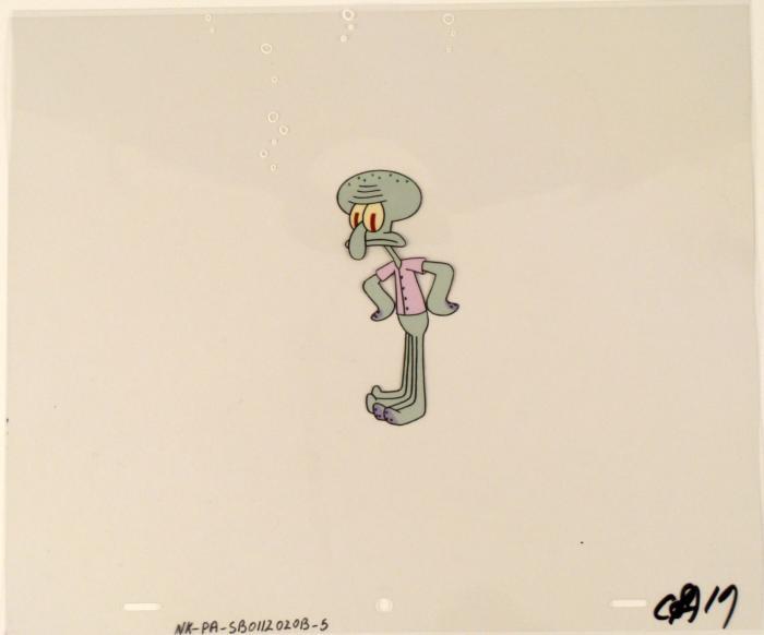 To create production cels, the original animator's drawing is transferred onto an acetate cel (by hand-inking and/or photo copying). The cel is then hand-painted on the reverse side. The cel is ready to be matted and framed. The animator's notations are at the bottom of the cel. The cel has multi-layers; first has bubbles, and then the second cel has Squidward on it.