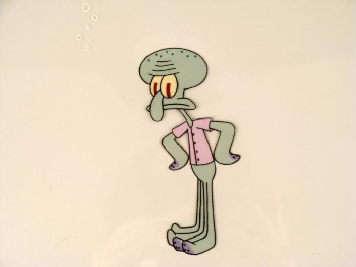 This original animation cel is from the Nickelodeon TV show SpongeBob Squarepants. The story takes place under the deep blue sea in Bikini Bottom, where SpongeBob resides. SpongeBob, who is a yellow, porous sponge, is your typical happy-go-lucky character, as he is always cheerful and enjoys making people laugh. Patrick Star, SpongeBob's neighbor who is a starfish, is your average children's show idiot, as he boasts knowing nothing and is often getting himself into ridiculous situations. Between the homes of these two lies the home of the miserable Squidward, a squid, who is known for being grouchy and playing tricks on SpongeBob and Patrick. Both SpongeBob and Squidward work at the Krusty Krab, a fast food business run by the greedy money-loving Mr. Krabs, a crab, the arch rival of the evil, possibly misunderstood, Plankton. Another neighbor, Sandy Cheeks, an athletic squirrel who normally wears an astronaut's space suit, was introduced in "Tea at the Treedome." She spends most of her time inventing and experimenting.What has Spongebob done this time? Original Production Animated Cel Overall Size of Cel: 10 1/2" x 12 1/2" Excellent ConditionThis is an original hand-painted cel set-up used in the production of an episode of "SpongeBob SquarePants." Each one-of-a-kind set-up represents a slight change in position of the characters. When individually photographed and projected in rapid succession, the images appear to move.