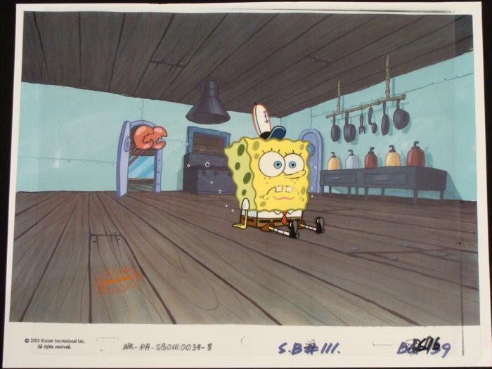 This animation cel and reproduction background are from the Nickelodeon TV show SpongeBob Squarepants. The story takes place under the deep blue sea in Bikini Bottom, where SpongeBob resides. SpongeBob, who is a yellow, porous sponge, is your typical happy-go-lucky character, as he is always cheerful and enjoys making people laugh. Patrick Star, SpongeBob's neighbor who is a starfish, is your average children's show idiot, as he boasts knowing nothing and is often getting himself into ridiculous situations. Between the homes of these two lies the home of the miserable Squidward, a squid, who is known for being grouchy and playing tricks on SpongeBob and Patrick. Both SpongeBob and Squidward work at the Krusty Krab, a fast food business run by the greedy money-loving Mr. Krabs, a crab, the arch rival of the evil, possibly misunderstood, Plankton. Another neighbor, Sandy Cheeks, an athletic squirrel who normally wears an astronaut's space suit, was introduced in "Tea at the Treedome." She spends most of her time inventing and experimenting. What happened???Original Printed Background and Animated Cel Overall Size of Background: 11" x 14" Overall Size of the Cel: 10 1/2" x 12 1/2" Very good condition This is an original hand-painted cel set-up used in the production of an episode of "SpongeBob SquarePants." Each one-of-a-kind set-up represents a slight change in position of the characters. When individually photographed and projected in rapid succession, the images appear to move.