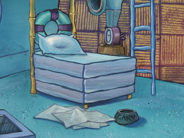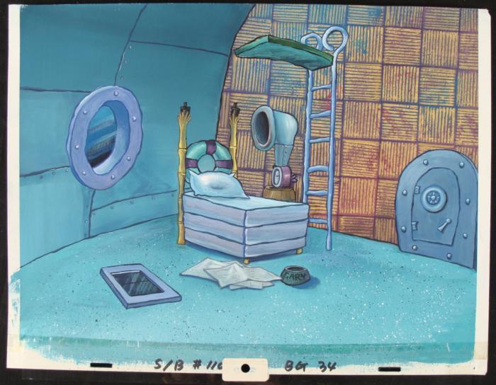 This original hand-painted background from the Nickelodeon TV show SpongeBob Squarepants. The story takes place under the deep blue sea in Bikini Bottom, where SpongeBob resides. SpongeBob, who is a yellow, porous sponge, is your typical happy-go-lucky character, as he is always cheerful and enjoys making people laugh. Patrick Star, SpongeBob's neighbor who is a starfish, is your average children's show idiot, as he boasts knowing nothing and is often getting himself into ridiculous situations. Between the homes of these two lies the home of the miserable Squidward, a squid, who is known for being grouchy and playing tricks on SpongeBob and Patrick. Both SpongeBob and Squidward work at the Krusty Krab, a fast food business run by the greedy money-loving Mr. Krabs, a crab, the arch rival of the evil, possibly misunderstood, Plankton. Another neighbor, Sandy Cheeks, an athletic squirrel who normally wears an astronaut's space suit, was introduced in "Tea at the Treedome." She spends most of her time inventing and experimenting. Spongebob should consider to pick up his bedroom every once and a while.Original Production Background Overall Size of Background: 13 1/2" x 17 3/4" Very good condition; it has been stored Original Production Backgrounds are used in the making of the final version of animated productions. The background establishes the location and the overall good mood of the scenee. Typically, a background layout artist creates a drawing to establish the content of the scene, placement of characters, perspective and camera angle. Based on this drawing, the background artist creates a preliminary painting to confirm all of the scenes details, then the final production background which is used in the filming of the scene. When these backgrounds are individually photographed behind the progression of production cels, and projected at a rapid succession, the images in the foreground appear to move, creating an animated scene. The background is ready to be matted and framed. It is a colored background with the animator's notations taped at the bottom.