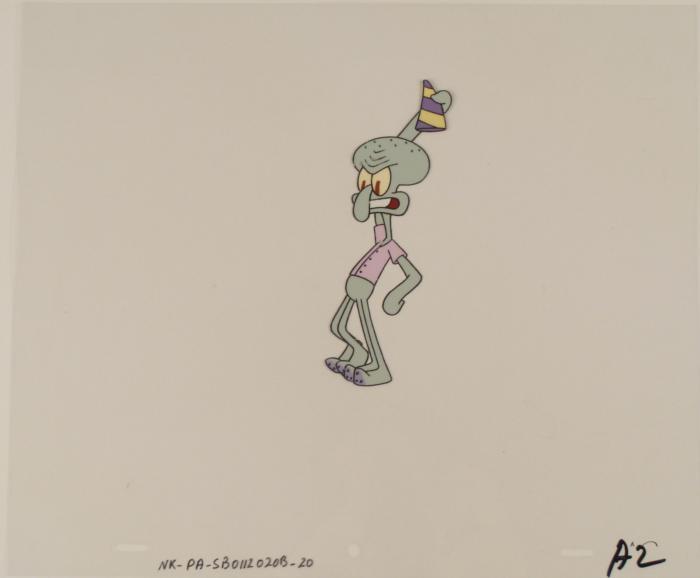 This original animation cel is from the Nickelodeon TV show SpongeBob Squarepants. The story takes place under the deep blue sea in Bikini Bottom, where SpongeBob resides. SpongeBob, who is a yellow, porous sponge, is your typical happy-go-lucky character, as he is always cheerful and enjoys making people laugh. Patrick Star, SpongeBob's neighbor who is a starfish, is your average children's show idiot, as he boasts knowing nothing and is often getting himself into ridiculous situations. Between the homes of these two lies the home of the miserable Squidward, a squid, who is known for being grouchy and playing tricks on SpongeBob and Patrick. Both SpongeBob and Squidward work at the Krusty Krab, a fast food business run by the greedy money-loving Mr. Krabs, a crab, the arch rival of the evil, possibly misunderstood, Plankton. Another neighbor, Sandy Cheeks, an athletic squirrel who normally wears an astronaut's space suit, was introduced in "Tea at the Treedome." She spends most of her time inventing and experimenting. Someone must have ruined Squidward's party!Original Production Animated Cel Overall Size of Cel: 10 1/2" x 12 1/2" Very Good ConditionThis is an original hand-painted cel set-up used in the production of an episode of "SpongeBob SquarePants." Each one-of-a-kind set-up represents a slight change in position of the characters. When individually photographed and projected in rapid succession, the images appear to move.
