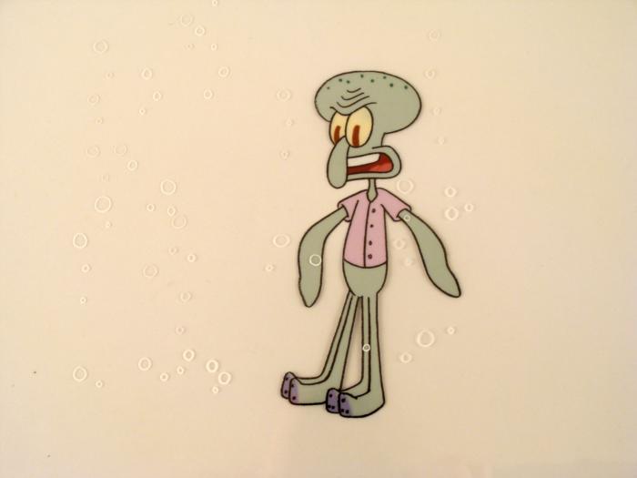 To create production cels, the original animator's drawing is transferred onto an acetate cel (by hand-inking and/or photo copying). The cel is then hand-painted on the reverse side. The cel is ready to be matted and framed. The animator's notations are at the bottom of the cel. The cel has multiple layers; the first two layers are of bubbles and then there is Squidward.