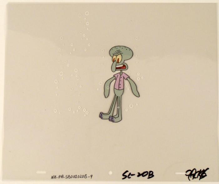 This original animation cel is from the Nickelodeon TV show SpongeBob Squarepants. The story takes place under the deep blue sea in Bikini Bottom, where SpongeBob resides. SpongeBob, who is a yellow, porous sponge, is your typical happy-go-lucky character, as he is always cheerful and enjoys making people laugh. Patrick Star, SpongeBob's neighbor who is a starfish, is your average children's show idiot, as he boasts knowing nothing and is often getting himself into ridiculous situations. Between the homes of these two lies the home of the miserable Squidward, a squid, who is known for being grouchy and playing tricks on SpongeBob and Patrick. Both SpongeBob and Squidward work at the Krusty Krab, a fast food business run by the greedy money-loving Mr. Krabs, a crab, the arch rival of the evil, possibly misunderstood, Plankton. Another neighbor, Sandy Cheeks, an athletic squirrel who normally wears an astronaut's space suit, was introduced in "Tea at the Treedome." She spends most of her time inventing and experimenting. Head for the hills! Squidwards is about to give someone a piece of his mind and it's not going to be pretty.Original Production Animated Cel Overall Size of Cel: 10 1/2" x 12 1/2" Excellent ConditionThis is an original hand-painted cel set-up used in the production of an episode of "SpongeBob SquarePants." Each one-of-a-kind set-up represents a slight change in position of the characters. When individually photographed and projected in rapid succession, the images appear to move.