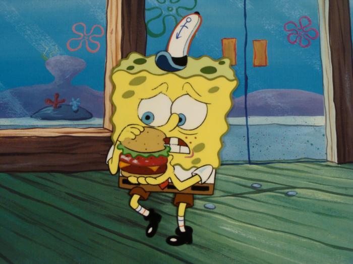 This animation cel and reproduction background are from the Nickelodeon TV show SpongeBob Squarepants. The story takes place under the deep blue sea in Bikini Bottom, where SpongeBob resides. SpongeBob, who is a yellow, porous sponge, is your typical happy-go-lucky character, as he is always cheerful and enjoys making people laugh. Patrick Star, SpongeBob's neighbor who is a starfish, is your average children's show idiot, as he boasts knowing nothing and is often getting himself into ridiculous situations. Between the homes of these two lies the home of the miserable Squidward, a squid, who is known for being grouchy and playing tricks on SpongeBob and Patrick. Both SpongeBob and Squidward work at the Krusty Krab, a fast food business run by the greedy money-loving Mr. Krabs, a crab, the arch rival of the evil, possibly misunderstood, Plankton. Another neighbor, Sandy Cheeks, an athletic squirrel who normally wears an astronaut's space suit, was introduced in "Tea at the Treedome." She spends most of her time inventing and experimenting. Well, can't go that way, new plan...Original Printed Background and Animated Cel Overall Size of Background: 11" x 17" Overall Size of the Cel: 10 1/2" x 12 1/2" Very good condition This is an original hand-painted cel set-up used in the production of an episode of "SpongeBob SquarePants." Each one-of-a-kind set-up represents a slight change in position of the characters. When individually photographed and projected in rapid succession, the images appear to move.