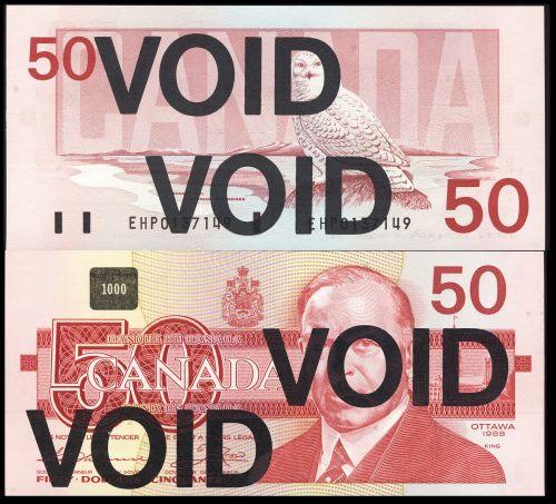 "Production Test note" Canada 1988 $50 Thiessen-Crow EHP0137149. The word "VOID" overprinted twice on face and back. The number "1000" is shown in the optical security device instead of "50". Gem Unc.. Quite unusual and first one seen by the catalo