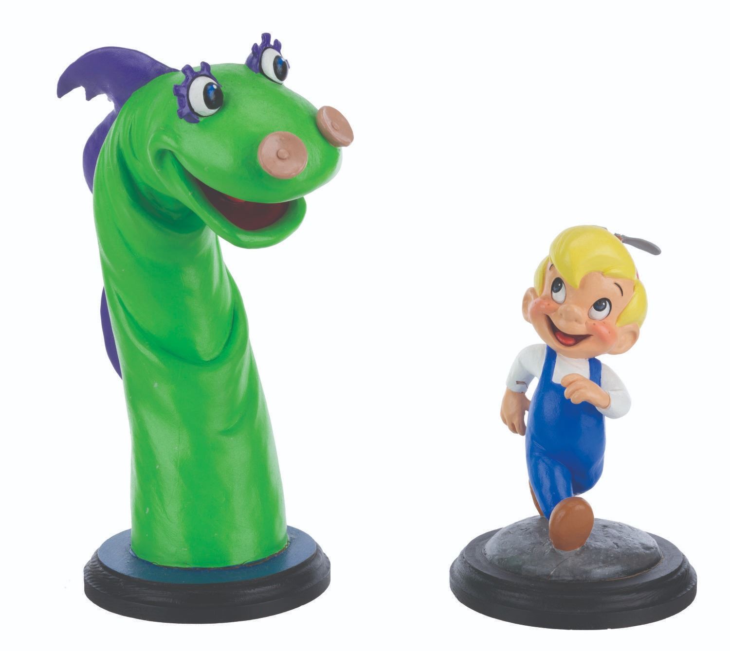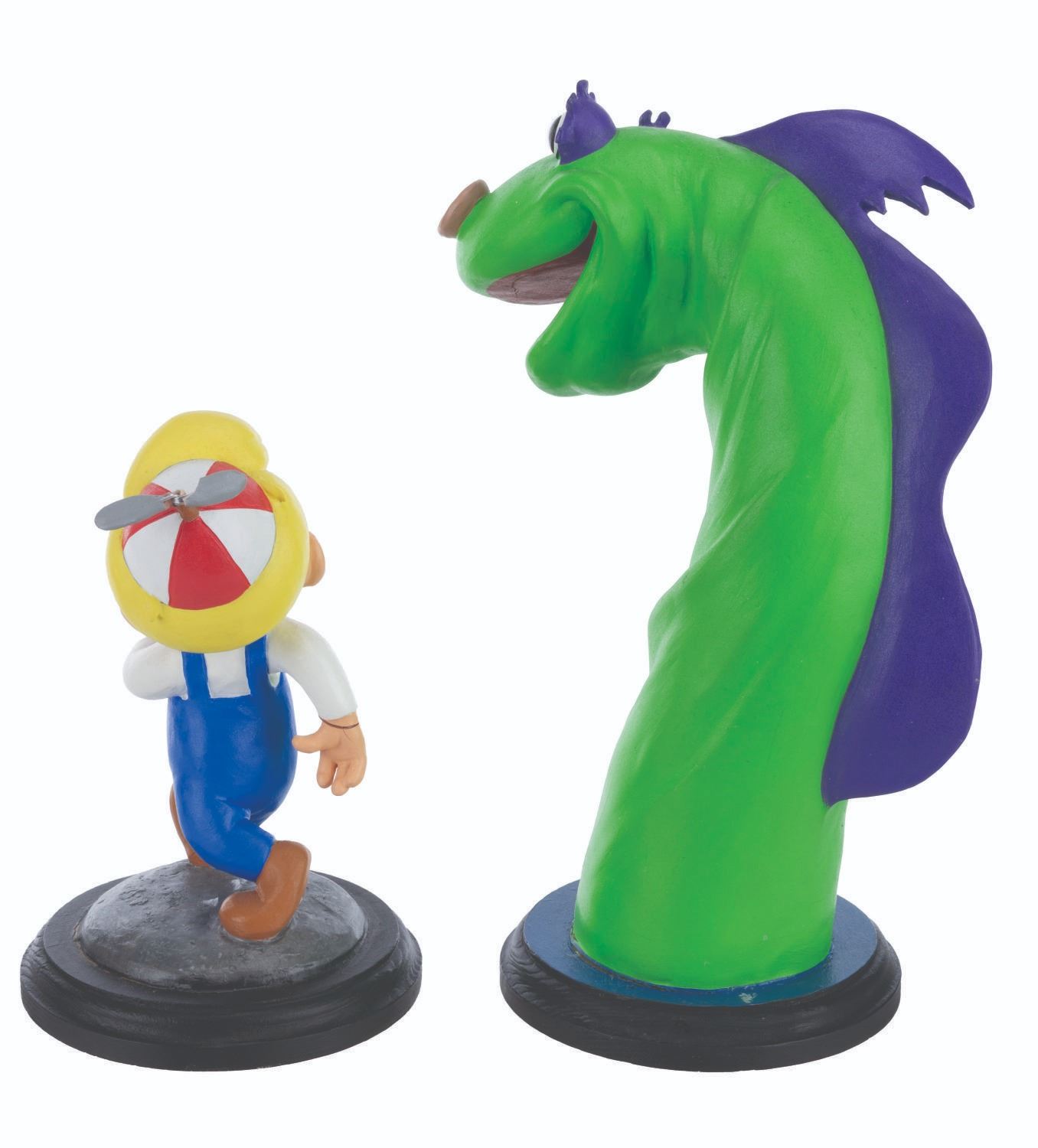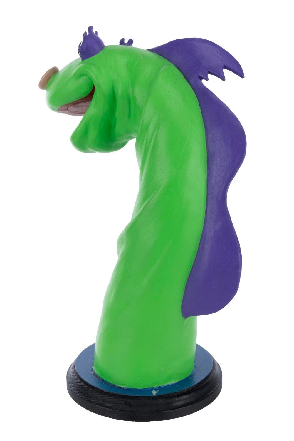 (DIC, 1988) A rare pair of animator’s maquettes for “The New Adventures of Beany and Cecil.” Maquettes are used by animators as a three-dimensional reference while animating the character. These were made by Kent Melton, who sculpted dozens of maquettes for Walt Disney, Warner Brothers, and other animation studios. Constructed with polymer clay and hand-painted, both Cecil and Beany maquettes are stamped with the number 5 and measure 3” x 7.5” x 10.25” tall and 2” x 4” and 6.75” tall on 0.5” thick wooden bases. Cecil displays in very good condition with a light crack along the bottom edge connecting the body to the base, while Beany displays in good condition with cracks to both wrists, hat propeller, right foot, and base. This lot requires special shipping arrangements. Please inquire before bidding.