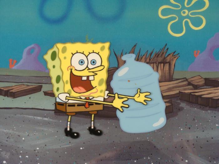 To create production cels, the original animator's drawing is transferred onto an acetate cel (by hand-inking and/or photo copying). The cel is then hand-painted on the reverse side. The background accompanying this set-up is a hand-painted original production background. The printed background is ready to be matted and framed. It is a colored background with a cel and has the animator's notations at the bottom of the background and the cel. The background is a printed reproduction background. The cel has multiple layers; first is the water jug and then is SpongeBob.