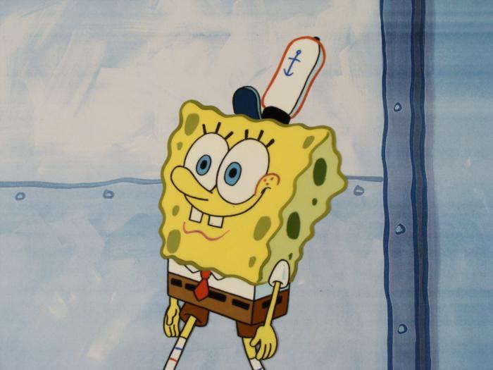 This animation cel and reproduction background are from the Nickelodeon TV show SpongeBob Squarepants. The story takes place under the deep blue sea in Bikini Bottom, where SpongeBob resides. SpongeBob, who is a yellow, porous sponge, is your typical happy-go-lucky character, as he is always cheerful and enjoys making people laugh. Patrick Star, SpongeBob's neighbor who is a starfish, is your average children's show idiot, as he boasts knowing nothing and is often getting himself into ridiculous situations. Between the homes of these two lies the home of the miserable Squidward, a squid, who is known for being grouchy and playing tricks on SpongeBob and Patrick. Both SpongeBob and Squidward work at the Krusty Krab, a fast food business run by the greedy money-loving Mr. Krabs, a crab, the arch rival of the evil, possibly misunderstood, Plankton. Another neighbor, Sandy Cheeks, an athletic squirrel who normally wears an astronaut's space suit, was introduced in "Tea at the Treedome." She spends most of her time inventing and experimenting. SpongeBob has his Krusty Krab hat on.Original Printed Background and Animated Cel Overall Size of Background: 11" x 17" Overall Size of the Cel: 10 1/2" x 12 1/2" Very good condition This is an original hand-painted cel set-up used in the production of an episode of "SpongeBob SquarePants." Each one-of-a-kind set-up represents a slight change in position of the characters. When individually photographed and projected in rapid succession, the images appear to move.