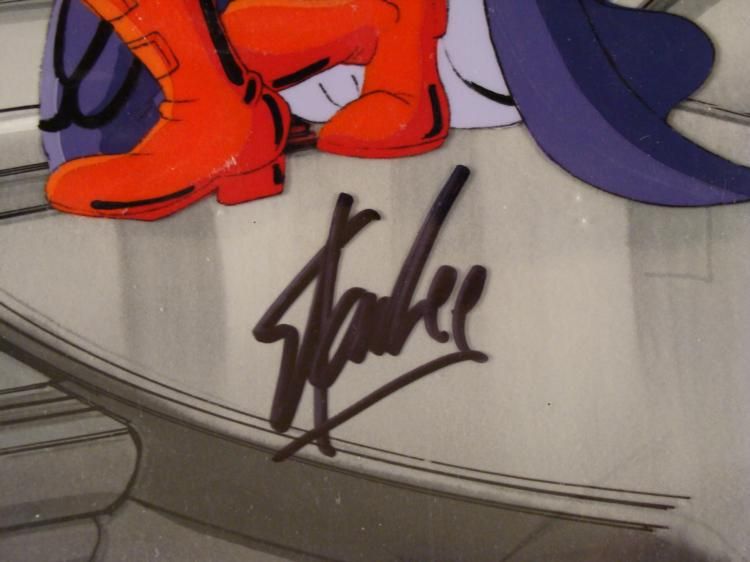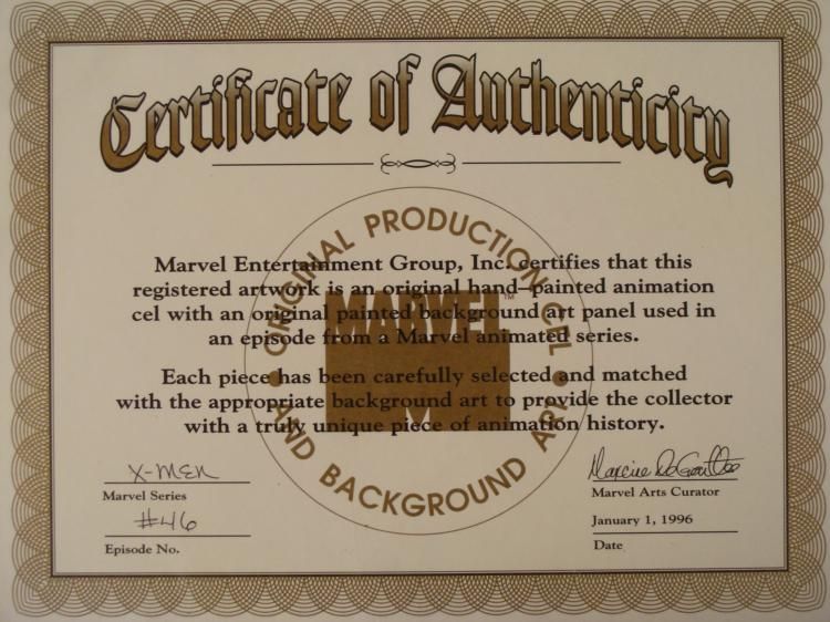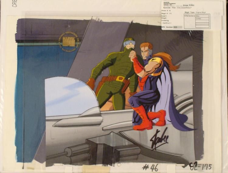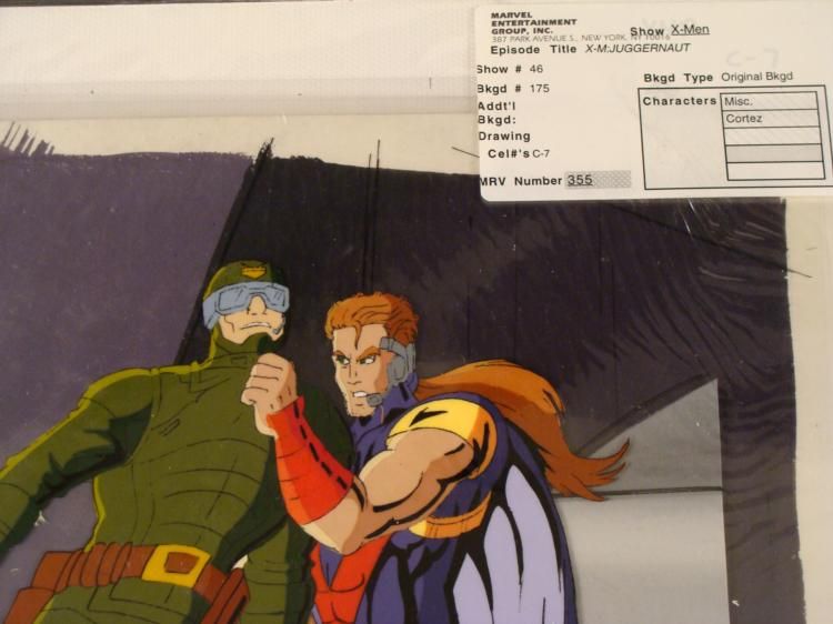 This is an original signed production cel and background from the hit series X-Men. Stan Lee signature is located on the right of cel in black sharpie. * * Under a cloud of increasing anti-mutant sentiment, Professor Xavier creates a haven at his Westchester mansion to train young mutants to use their powers for the benefit of humanity, and to prove mutants can be heroes. Xavier recruited Cyclops, Iceman, Angel, * Beast and Jean Grey calling them "X-Men" because they possessed the "x-gene", an ability normal humans lacked. Early issues introduced the team's arch enemy, Magneto and his Brotherhood of Evil Mutants, who would later battle the X-Men for years. * * Cortez takes no crap from nobody. * * * * * Original Animated Cel & Production BackgroundMedium: Hand painted acetate celDetails: Animation notations and peg holes * * Overall Size of the Cel: 10 1/2" x 12 1/2" * Overall Size of the background: 10 1/2" x 14 1/4" * Excellent Condition * This is an original hand-painted cel set-up used in the production of an episode of X-Men titled "JUGGERNAUT." Each one-of-a-kind set-up represents a slight change in position of the characters. When individually photographed and projected in rapid succession, * the images appear to move. * * To create production cels, the original animator's drawing is transferred onto an acetate cel (by hand-inking and/or photo copying). The cel is then hand-painted on the reverse side. The background accompanying this set-up is an original production background. * * * The cel and original background is ready to be matted and framed. The animators notations are located at the bottom of the cel and background. A Certificate of Authenticity from Marvel is on the back * of background. The Marvel Seal is located at the top left of the cel. The cel and background are in a protective sleeve. An information card about the episode is located at the top right of the protective sleeve. *