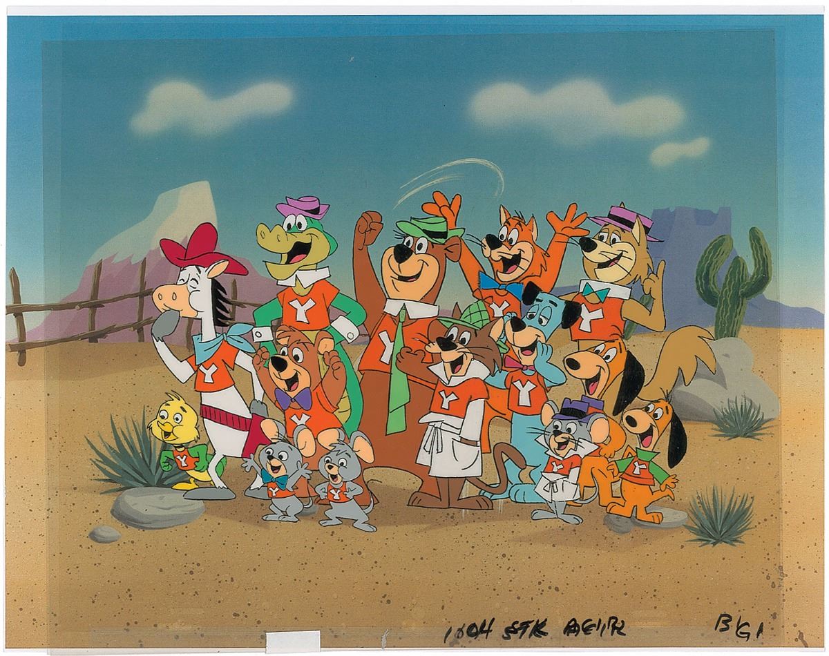 (Hanna-Barbera Studios, 1977) Fantastic original production cel featuring the Yogi Yahooeys team of Huckleberry Hound, Quick Draw McGraw, Wally Gator, Yogi Bear, Bo Bo, Yakky Doodle, Jinks, Pixie and Dixie, Hokey Wolf, Augie Doggie, Doggie Daddy, Snooper, and Blabber from Scooby Doo’s All Star Laff-A-Lympics. The cel is placed on a color copy background. Image measures 10 x 5.75, with overall dimensions of 14 x 11. In fine condition.