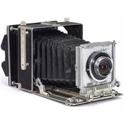 € 160,- Micro Precision Products, England, zahlreiche Verstellmöglichkeiten, Schneider Xenar 4,5/180, Compur bis 1/200 Sek., lange Zeiten nicht zuverlässig. Sonst technisch einwandfreie Kamera. Nur etwas Pflege erforderlich. Mit 4 "Film holders". Long times not reliable, otherwise technically without faults. It only needs some care. - (3-/3) - € 275/350 - (62/43)