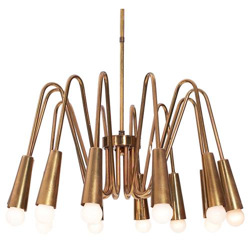 Professor D. Moor ceiling fixture, by Bronzewarenfabrik AG, Switzerland, brass form with 12 bent arms, unmarked, a variation of this form is pictured in Alexander Koch Catalog from the 1950s, 19"dia., very good condition