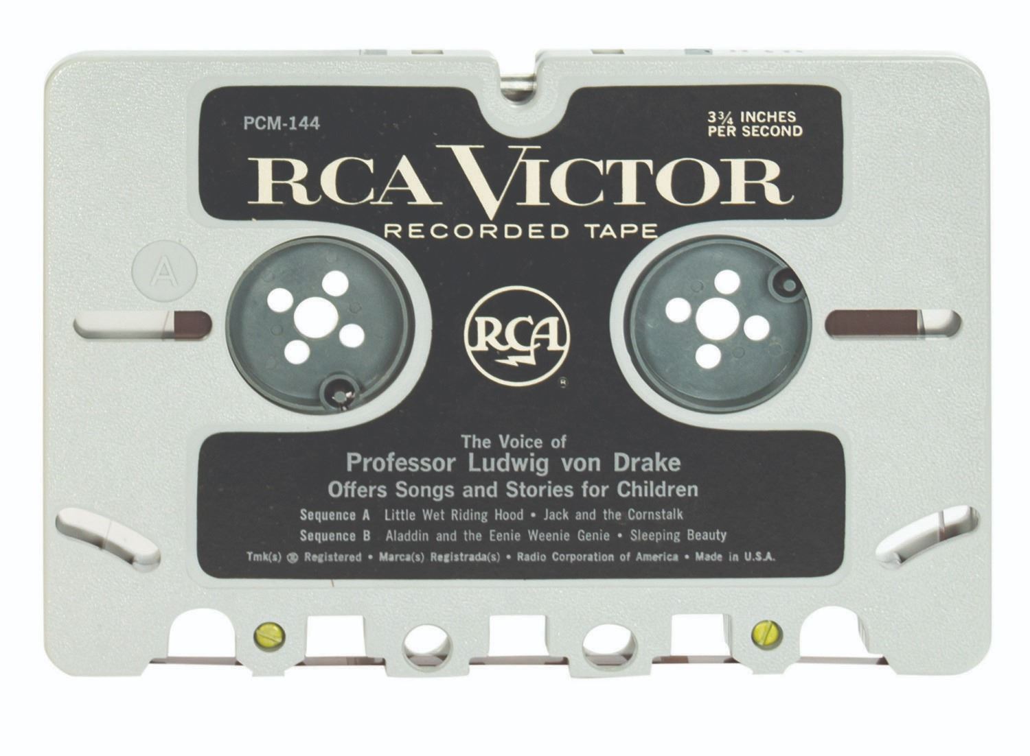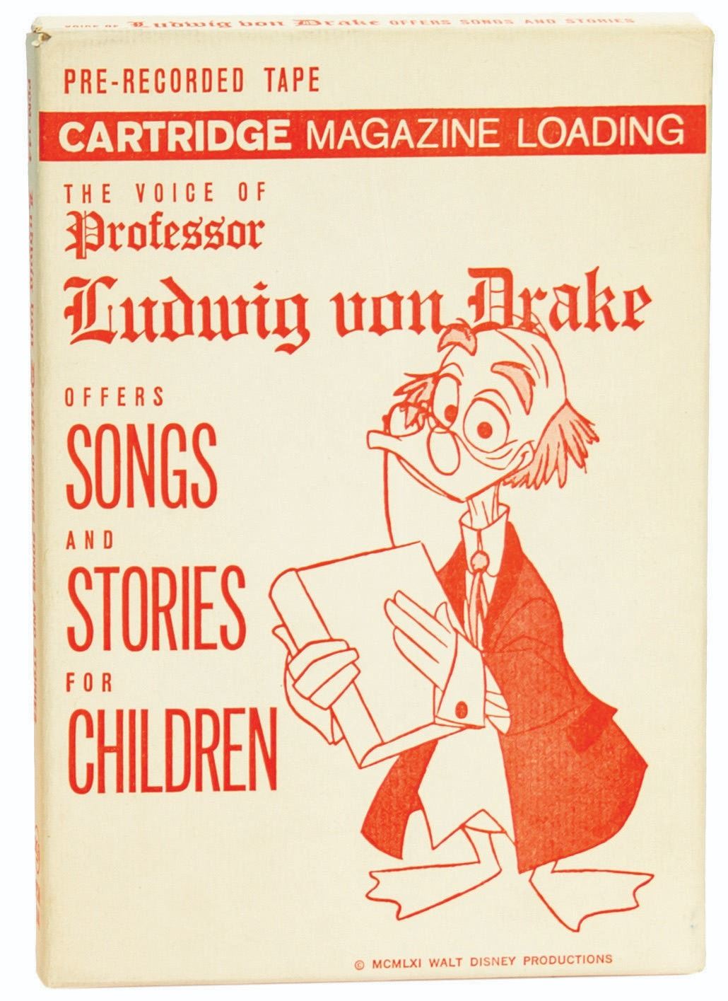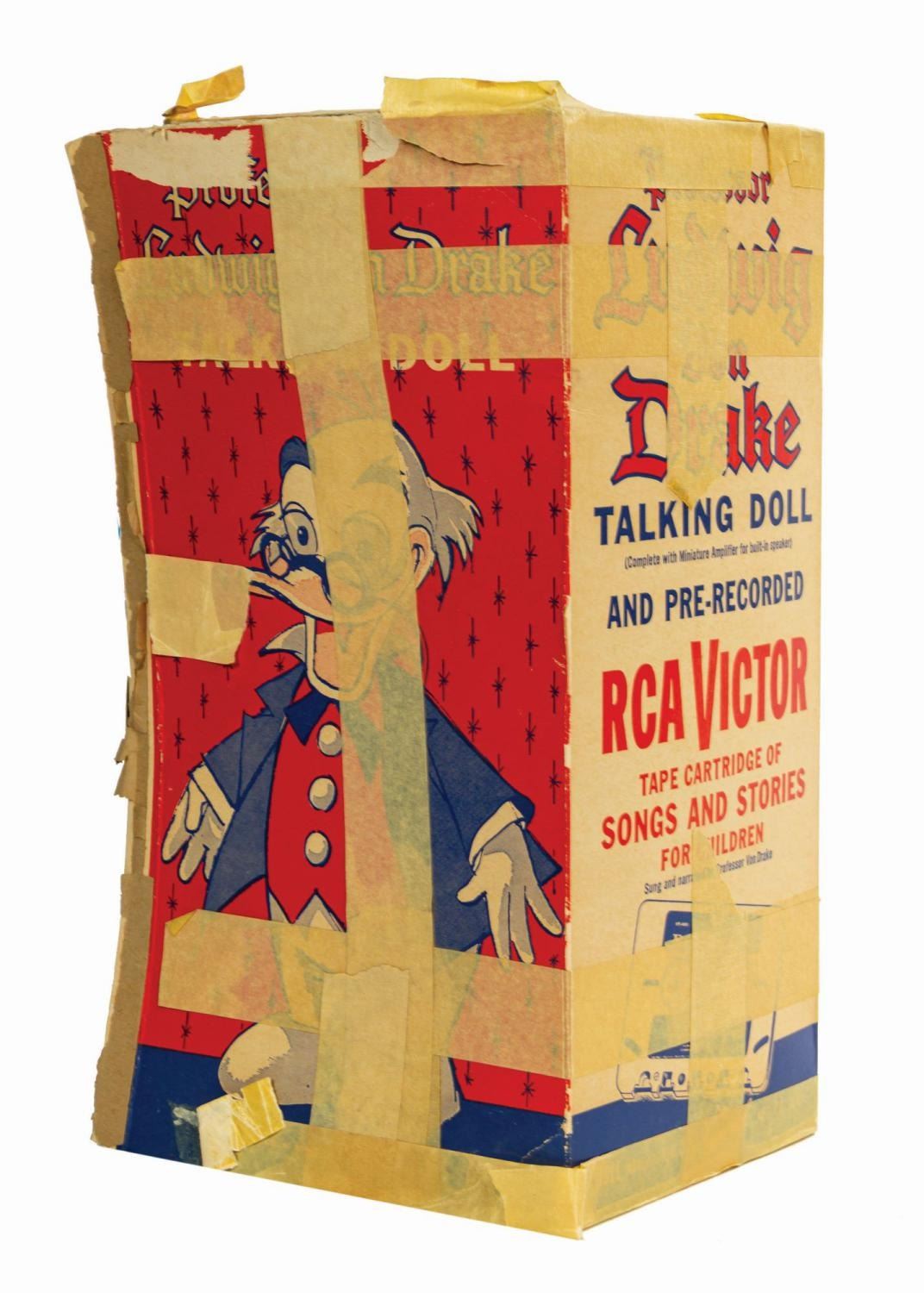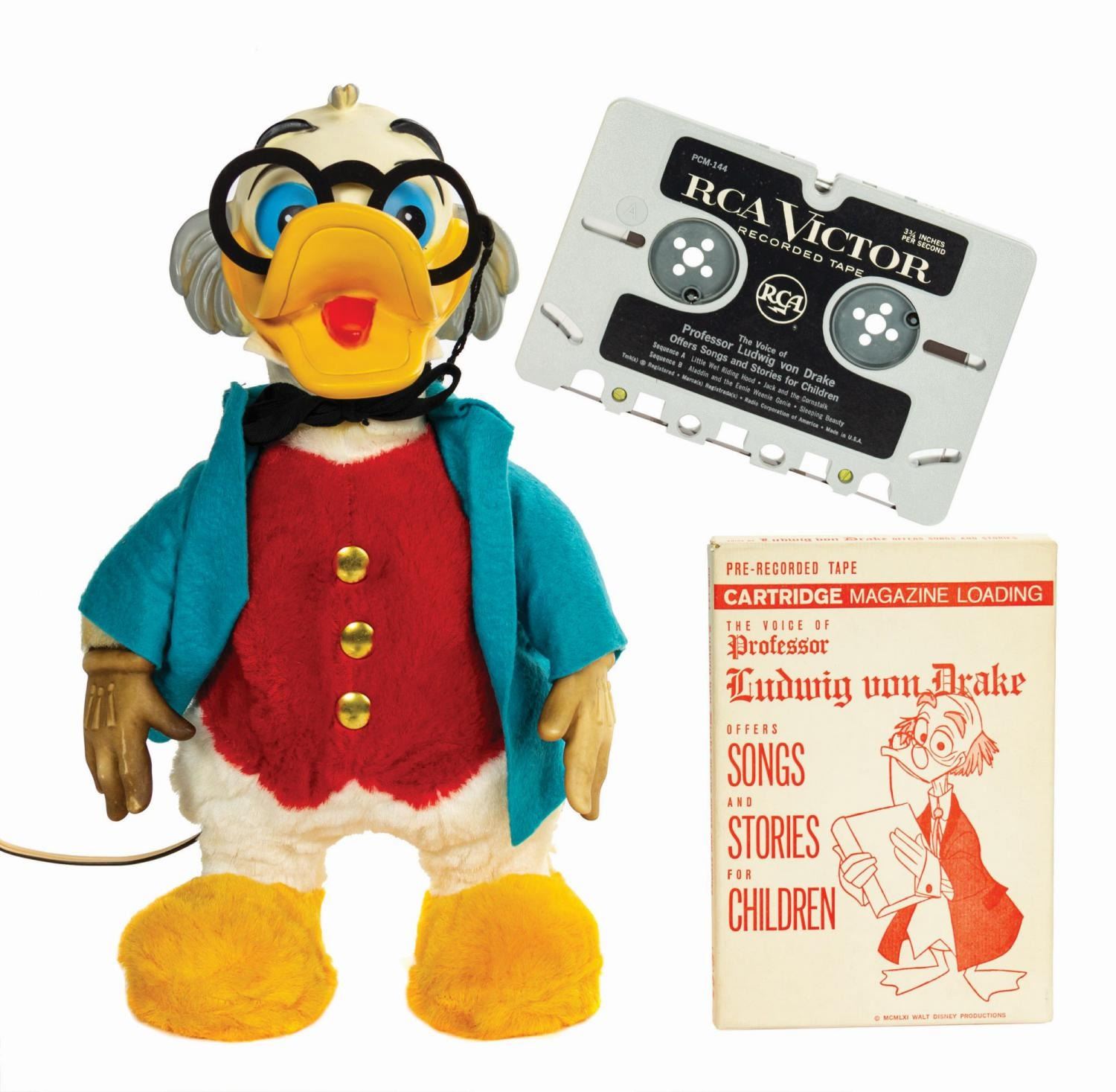 (Gund, 1963) A vintage Professor Ludwig Von Drake Talking Doll manufactured by Gund. A speaker is embedded in the torso, and an amplification unit in a plastic tube is attached via wire. The amplifier tube is intended to connect to an RCA Victor tape cartridge recorder, and the doll comes with a pre-recorded tape cartridge (in a separate box) containing the voice of Ludwig von Drake, Paul Frees, singing songs and telling stories. A vintage earpiece and the original cardboard box packaging are also included. Measuring 14.5"x9.75" and 4.5 deep, the doll is in very good condition with some blackening to the head and hands, slight yellowing to the fur, and general wear. The box is in fair condition with applied masking tape, small tears, and general wear. The electronics appear to be in unmarred condition but have not been tested.