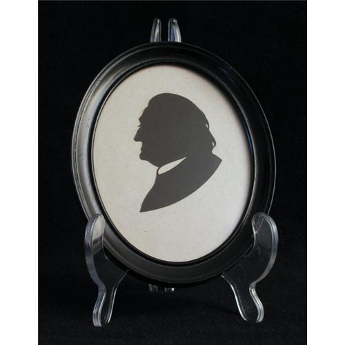Charming profile silhouette portrait of an elderly gentleman cut from black paper pasted onto a white background in a black oval frame.