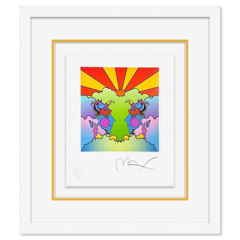 "Profile and Sunrise" is a limited edition lithograph on paper by Peter Max, numbered and hand signed by the artist. This piece comes framed. Includes Certificate of Authenticity from Peter Max Studios. Measures approx. 18.5" x 16.5" (frame), 8.5" x 6.5" (image). This item requires special handling and may have a longer than usual turnaround.