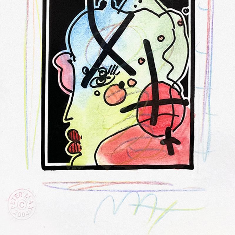 "Profile" is a one-of-a-kind mixed media on paper, hand signed by Peter Max. The piece comes custom framed with a backside cutout to display Peter Max Studio registration number 370676 certifying authenticity. Measures approx. 22.5" x 21.5" (frame), 8" x 6" (image).