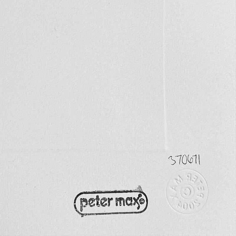 "Profile" is a one-of-a-kind mixed media on paper, hand signed by Peter Max. The piece comes custom framed with a backside cutout to display Peter Max Studio registration number 370671 certifying authenticity. Measures approximately 23" x 21" (frame), 9" x 7" (image).