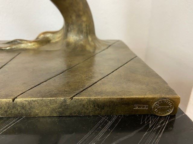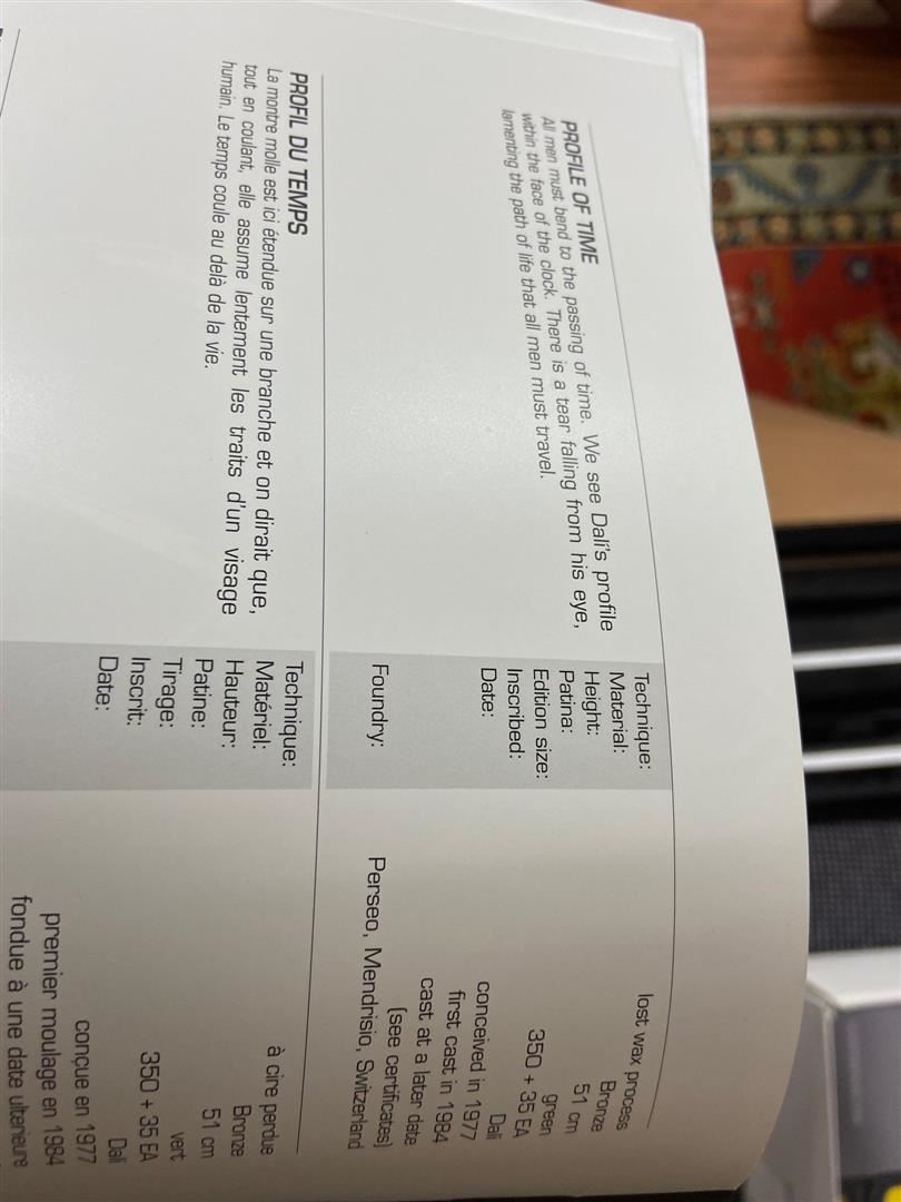 Dali's melting clock is featured in this Ltd edition 25" tall bronze sculpture cast in Switzerland, with granite base. Edition of 385. 13.5wx9.5" deep. In Robert Descharnes Catalog. Some oxidation on the face of the clock.E.A.
