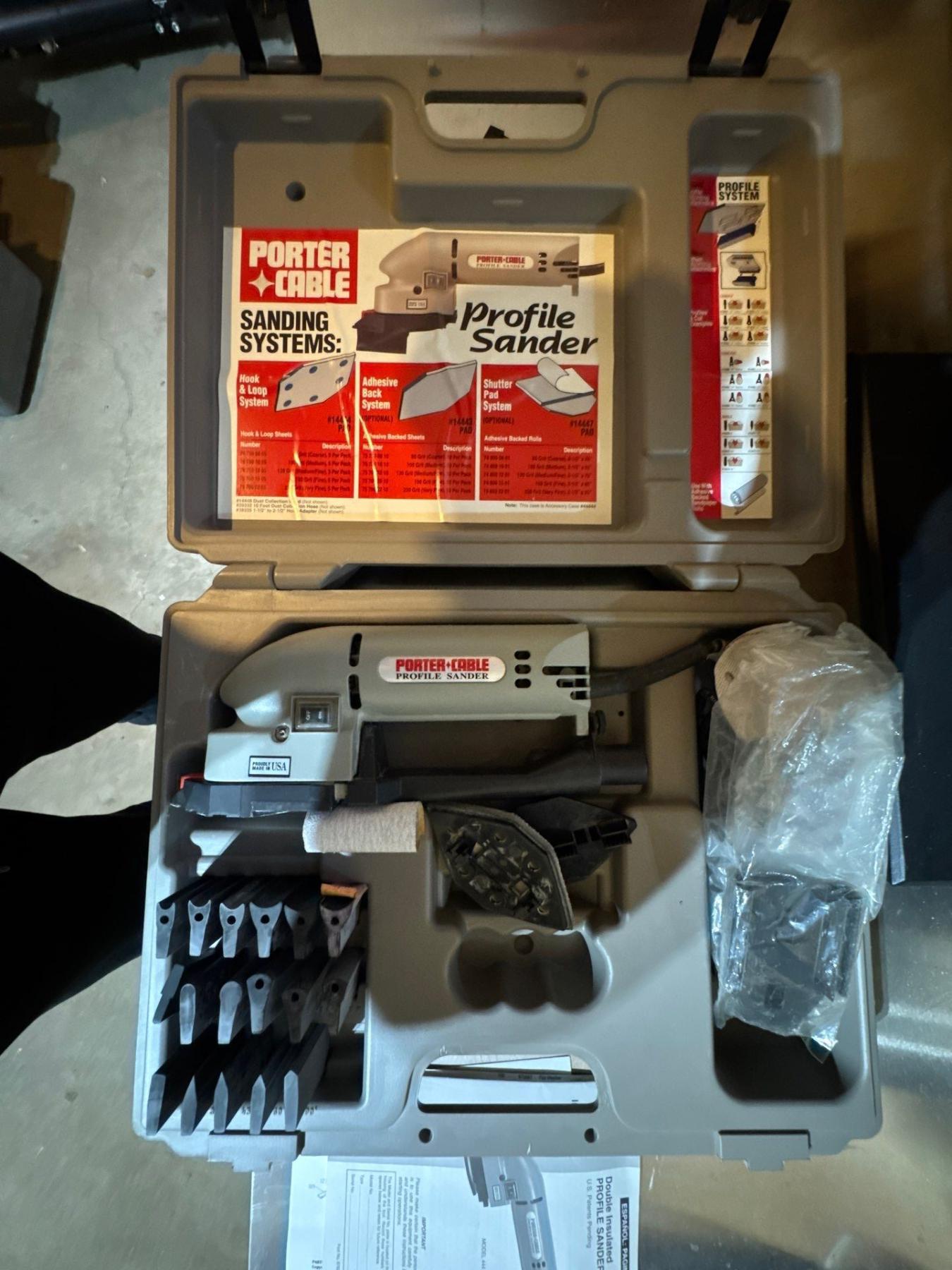Profile sander, porter cable with attachments and instruction manual. Double insulated profile sander
