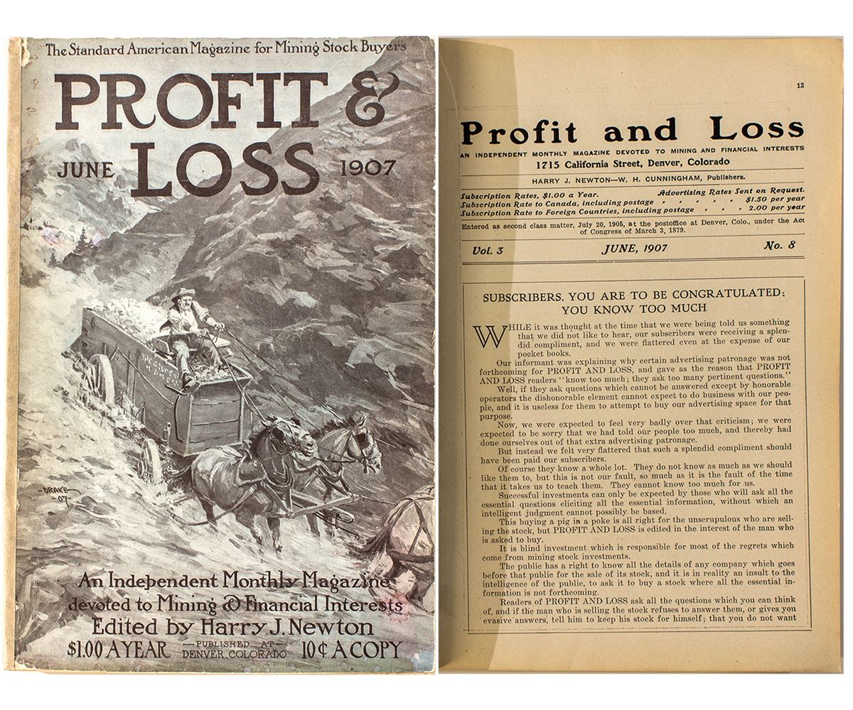Vol. 3. No. 8. "The Standard American Magazine for Mining Stock Buyers." "An Independent Monthly Magazine Devoted to Mining and Financial Interests." Edited by Harry J. Newton. Published in Denver. Softcover with stapled binding. 7 x 10", 212 pages. This issue features articles on: Cripple Creek, Leadville, the Wonder District, Pioche, Joplin, Bullfrog District, Shasta County copper, Yerington & Buckskin, Mina, Luna & Fitting District of Nevada, Dutch Creek, and "News from Busy California Camps," among other topics. The Cripple Creek article features many sketches of the various mines. There are photographs of the mines in the Wonder District (Nevada). The issue features 14 pages of reports from various Western mining companies, as well as ads throughout. Cover is detached from spine, but present. Minimal toning and wear to pages.
