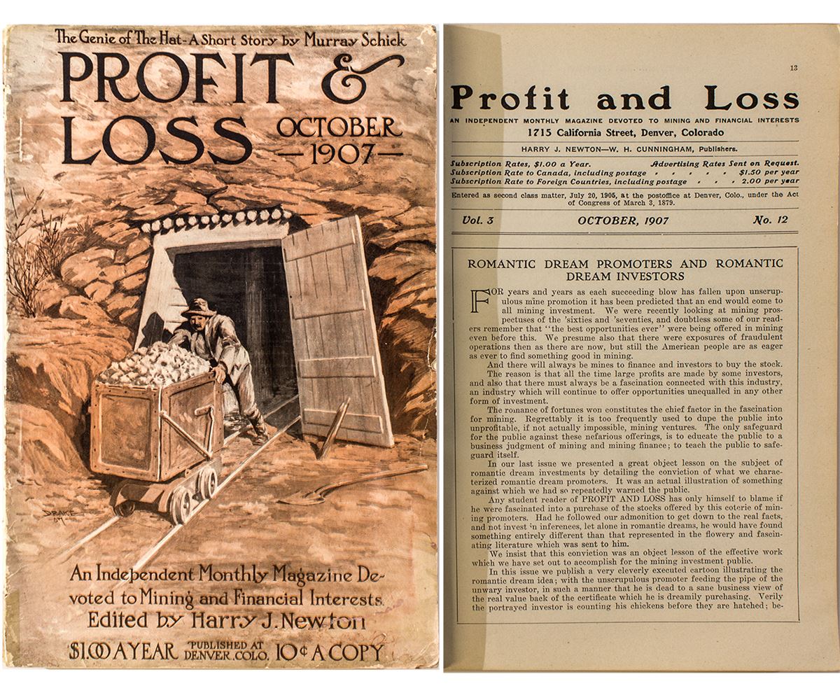 Vol. 3. No. 12. "The Standard American Magazine for Mining Stock Buyers." "An Independent Monthly Magazine Devoted to Mining and Financial Interests." Edited by Harry J. Newton. Published in Denver. Softcover with stapled binding. 7 x 10", 204 pages. Features articles on: Montezuma (with photos), a review of the mining & oil industry in California, review of the Nevada mining stock markets, Routt County (with photos), Manhattan, Bullfrog District, Cobalt District, Snake River Mining District, Searchlight, New Mexico mining camps, Gilpin County, Winnemucca, Leadville, and San Juan, among other topics. Eight pages are dedicated to short news and reports from mining camps across the Western states. Portions of the spine are missing. Pages are clean.