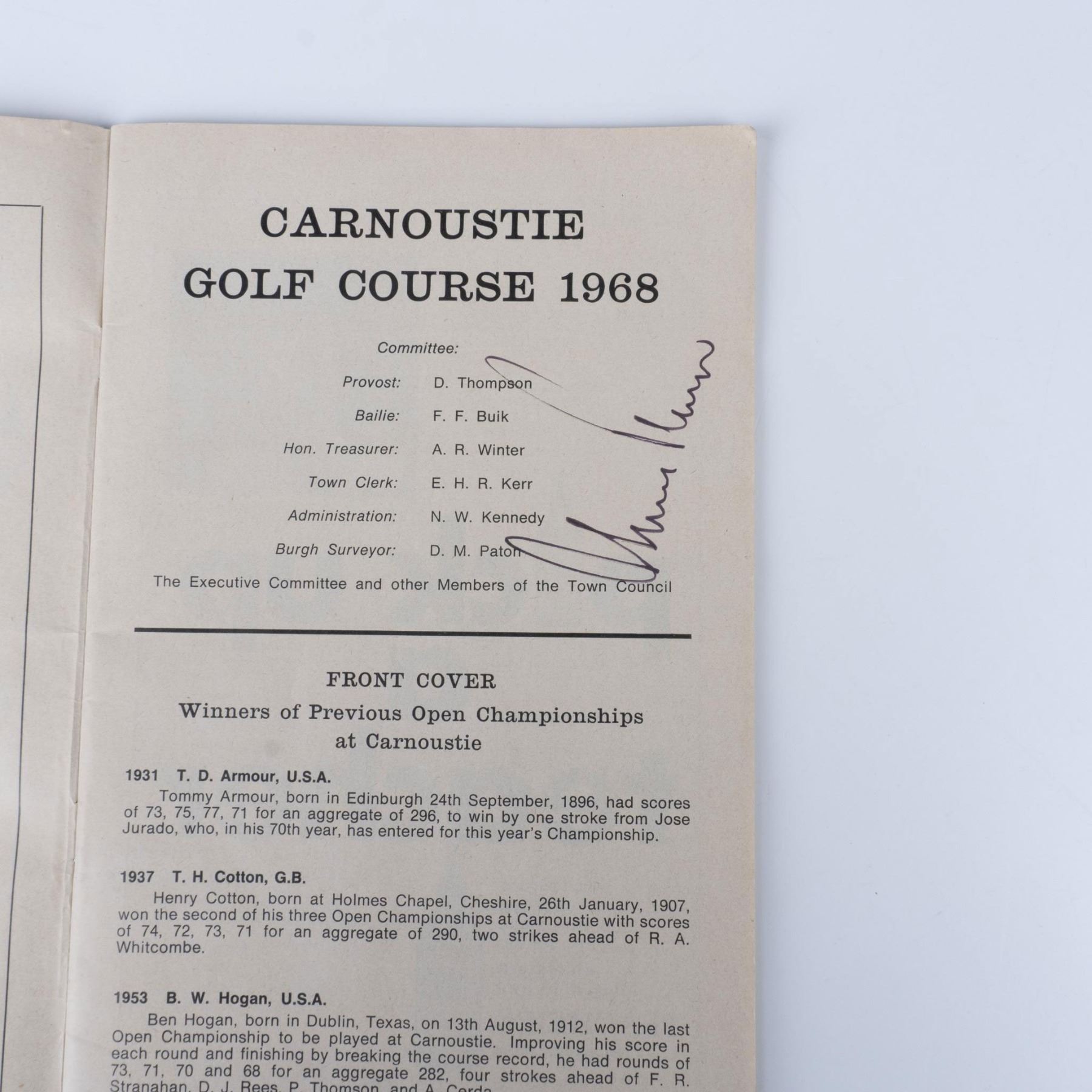 Official program for the Open Golf Championship 1968 held at Carnousite Golf Links July 10th-13th. Arnold Palmer's signature is on page 3. He came in 59th place at this tournament. Lee Trevino won for the first time this year, beating out Jack Nicklaus. Issued: 1968