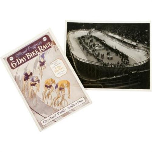 <B>Program and Photo from the Cleveland Bike Races.</B></I> Includes an official program from the 1934 Cleveland's Third International 6-Day Bike Race at the Cleveland Public Auditorium, in which is a roster and biography of each racer. Also included is a black and white 8" x 10" photo of the race track from the Cleveland Bike Races (year undetermined). <I>From the collection of Cliff Henderson.</B></I><BR><BR><b>Shipping:</b> Flat Material, Small (<a target="_blank" href="http://www.heritageauctions.com/common/shipping.php">view shipping information</a>)