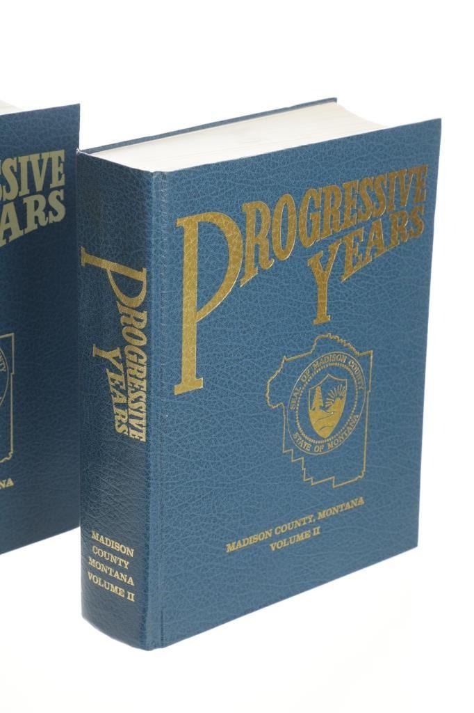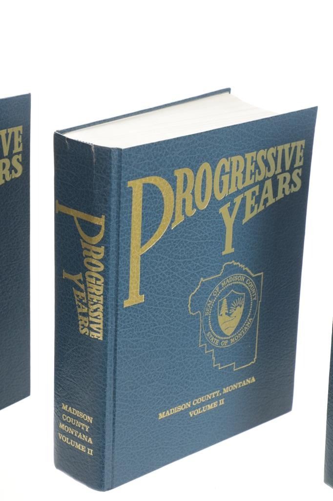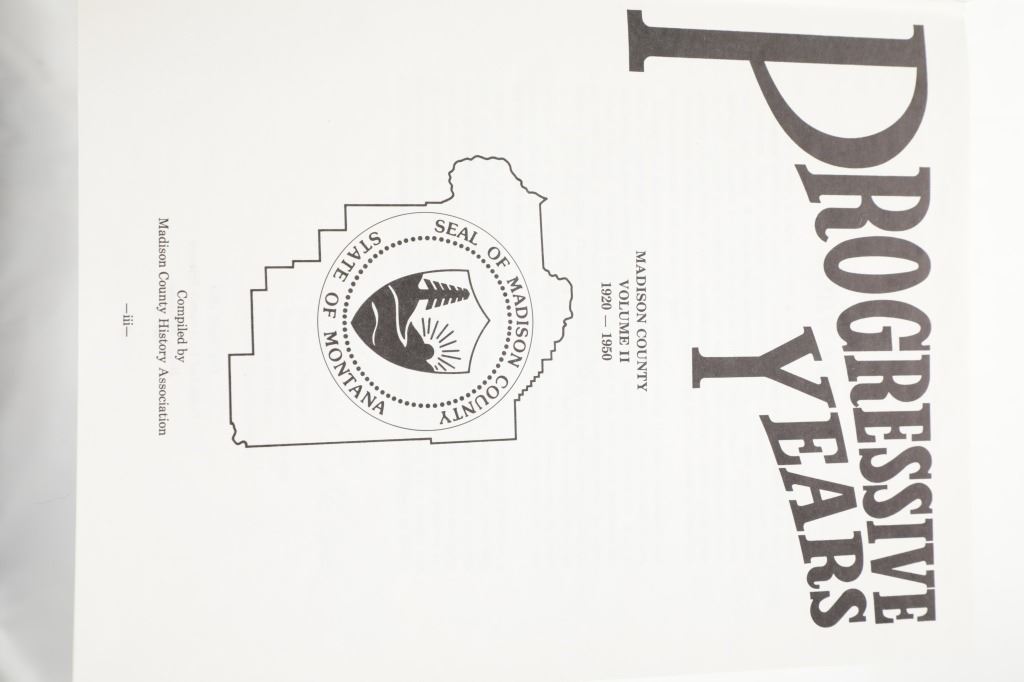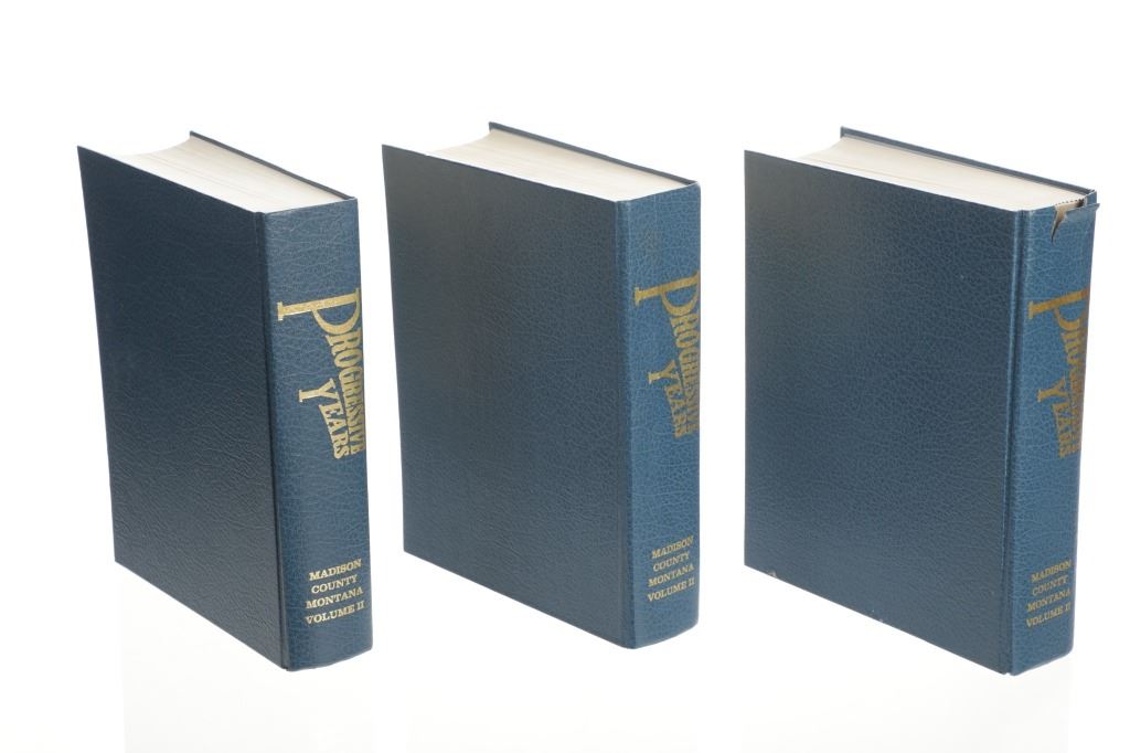 Featured in this lot is this 1920-1950 Progressive Years Madison Count, Montana Volume II book collection. There are three books in this collection. The books are a compiled history of Madison County Montana by the Madison County History Association. The books show blue cloth covered cover and binding with gilt lettering and a gilt perimeter of Madison County with a gilt seal of Madison County. The condition of this trio of books is fair to good with one of the books books showing a tear in the top of the spine of the book but otherwise is in fair to good overall condition. The measurements of this trio of books are 11 1/4" x 8 3/4". All three are Volume II.