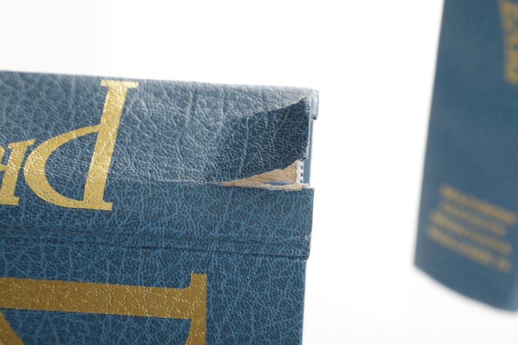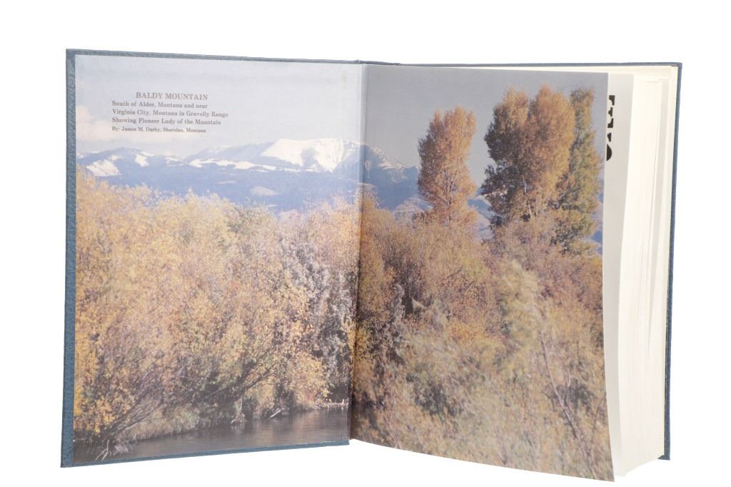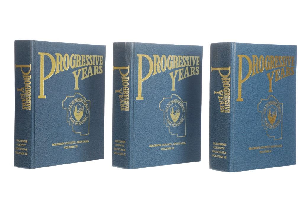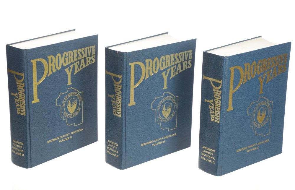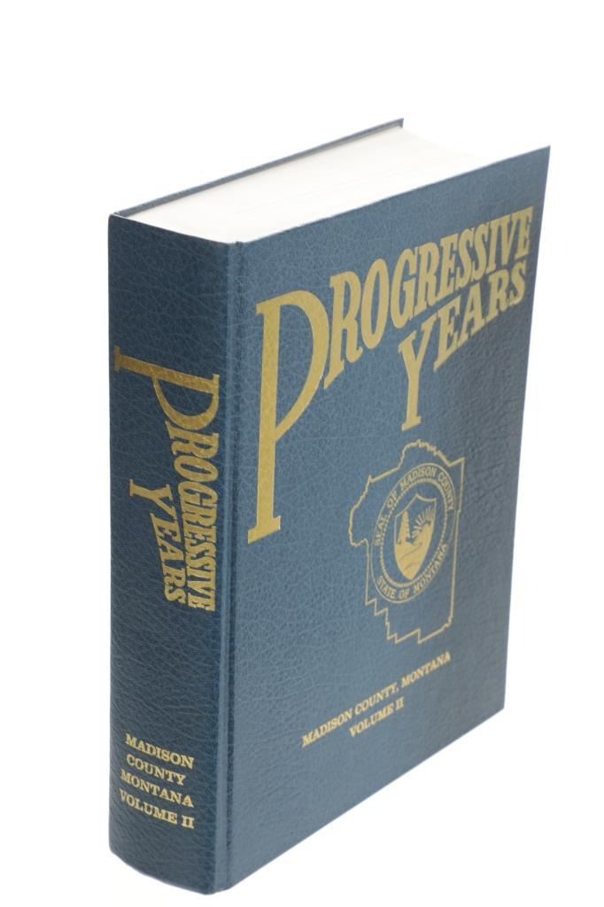 Featured in this lot is this 1920-1950 Progressive Years Madison Count, Montana Volume II book collection. There are three books in this collection. The books are a compiled history of Madison County Montana by the Madison County History Association. The books show blue cloth covered cover and binding with gilt lettering and a gilt perimeter of Madison County with a gilt seal of Madison County. The condition of this trio of books is fair to good with one of the books books showing a tear in the top of the spine of the book but otherwise is in fair to good overall condition. The measurements of this trio of books are 11 1/4" x 8 3/4". All three are Volume II.