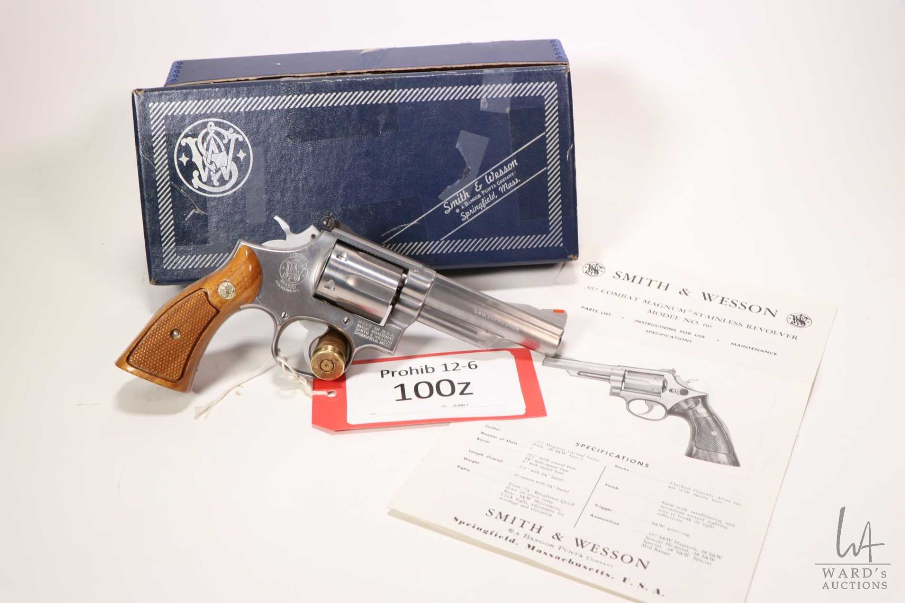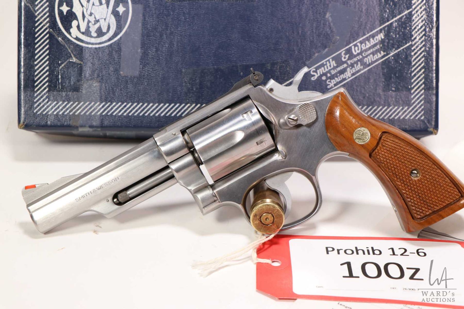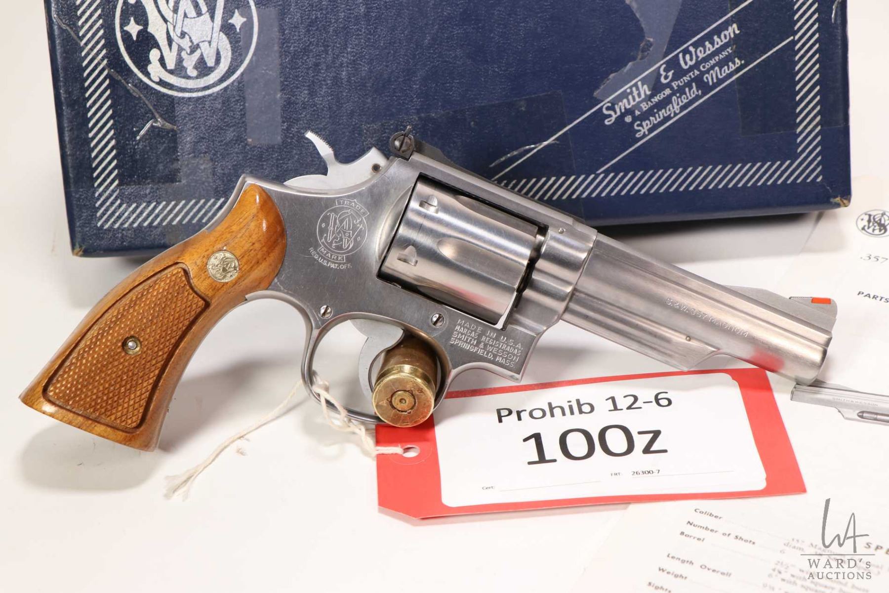 Prohib 12-6 handgun Smith & Wesson model 66-1, .357 Magnum six shot double action revolver, w/ bbl length 102mm [Stainless steel with fixed front and adjustable rear sights. Branded wooden checkered grips. Includes original owner's documentation and box. Slight cylinder ring and otherwise appears to have had very little use with only minor handling marks.] serial # 57K7783, PAL required