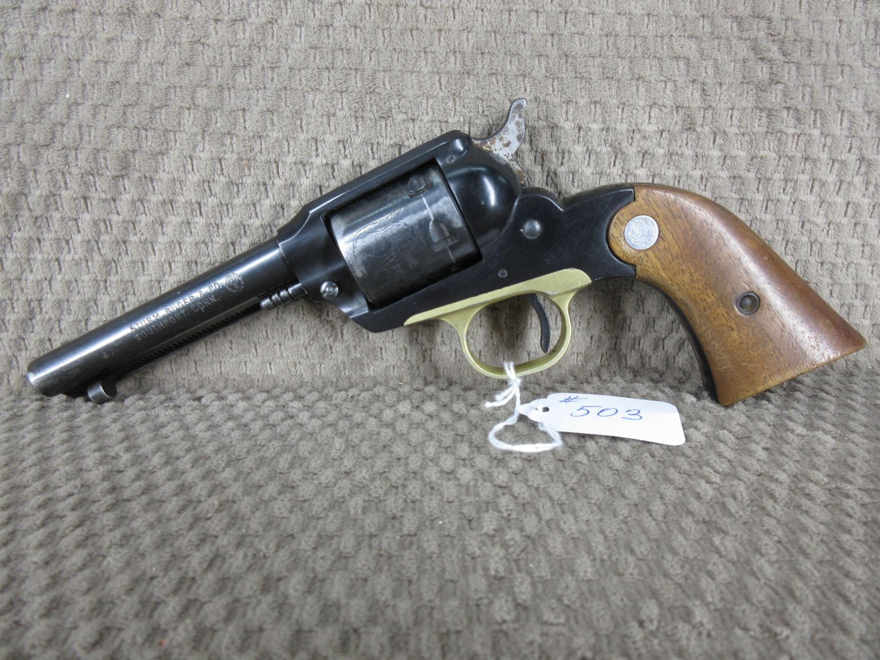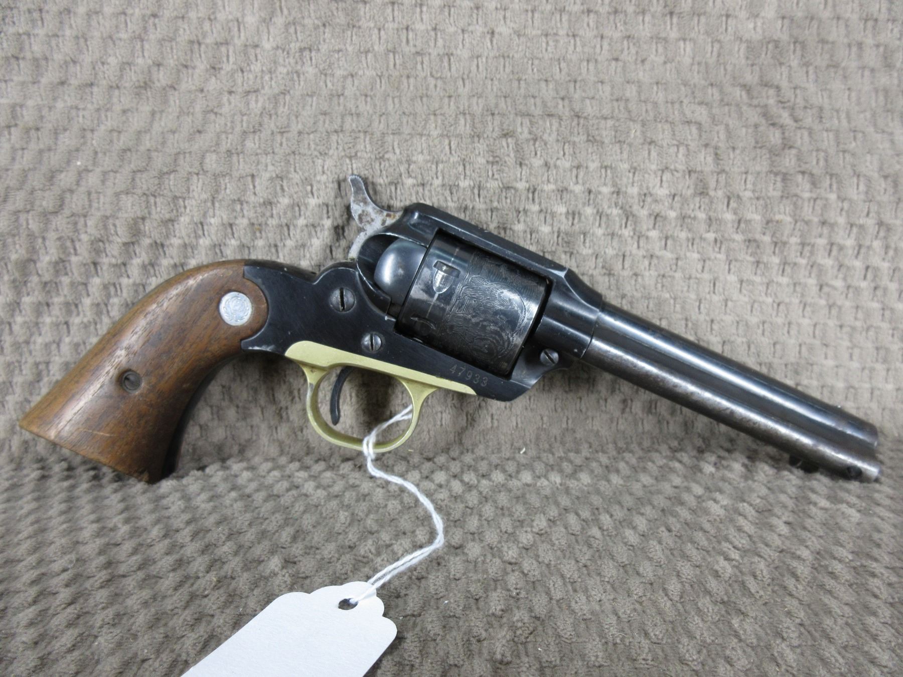 Prohib - Ruger Bearcat in 22 Long Rifle - This six shot single action revolver appears to be in good working order. Barrel is 102MM, bluing is good with light piiting, rifling is excellent, front blade broken fixed rear sight, wood is good with small chip. Ruger now has restricted barrels available.