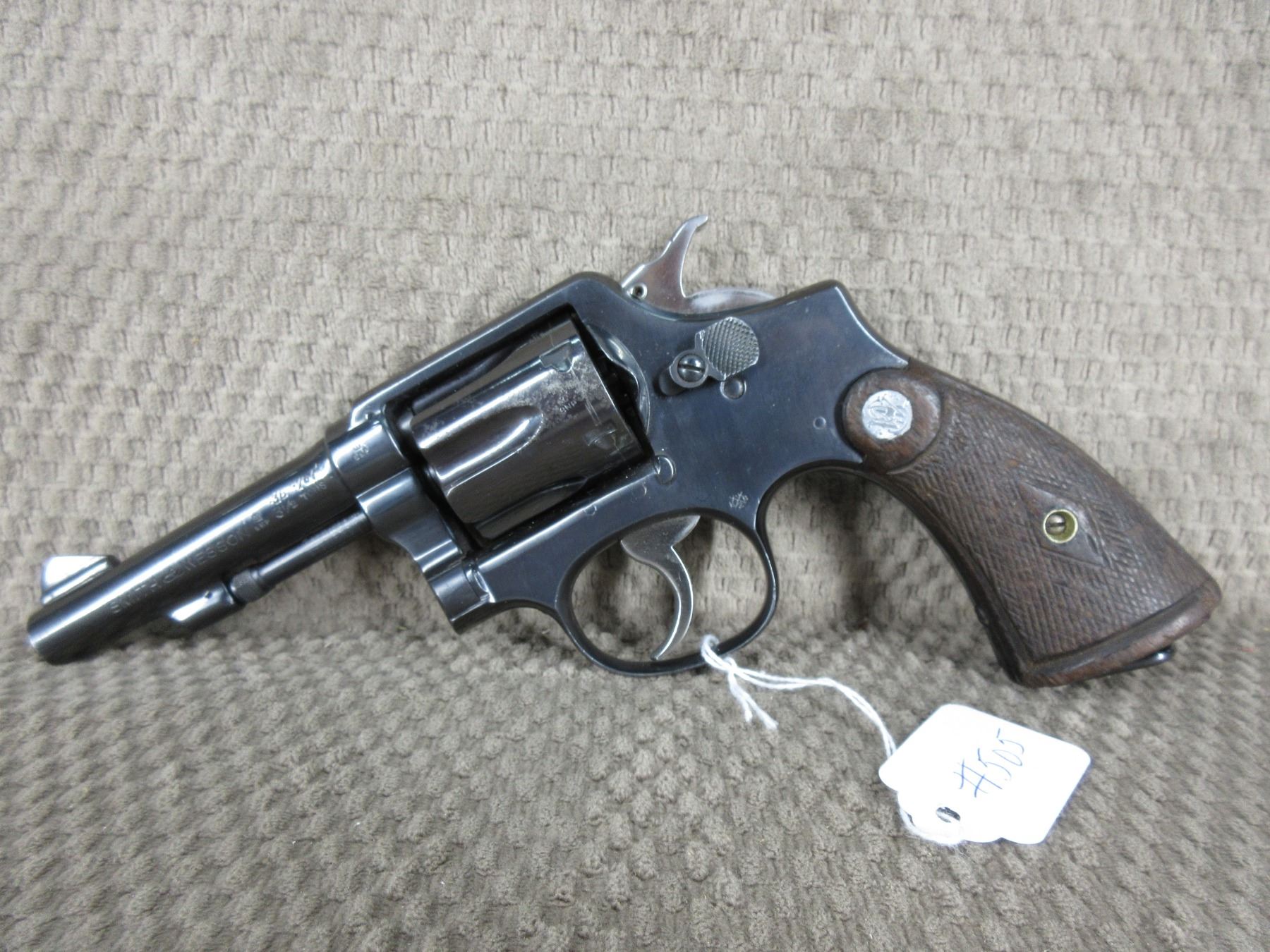 Prohib - Smith & Wesson Model 38-200 in 38 S&W - This British six shot double action revolver with flip out cylinder appears to be in excellent working order. Barrel is 102MM, bluing is fair and has been reblued, rifling is good, fixed sights, wood is fair with chips and worn, has lanyard ring.