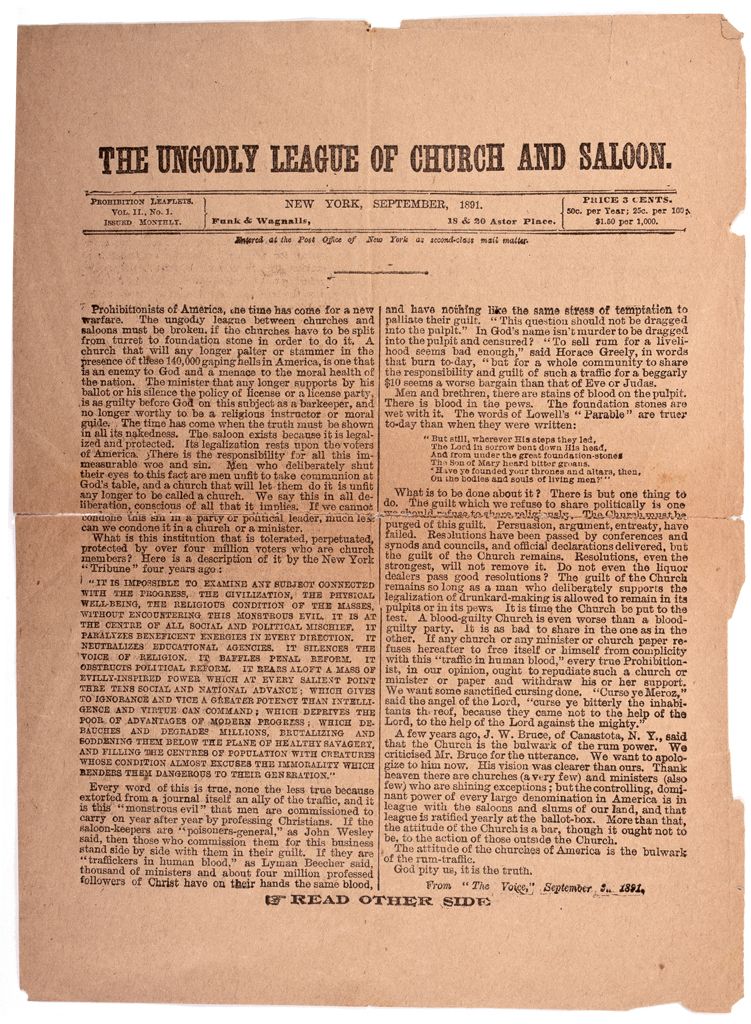 Measures 10.25” x 7.5”, some wear, including crease and tears along the sides and in the middle. The leaflet promotes two sermons; “The Ungodly League of Church and Saloon” and "Touch Not the Unclean Thing.” Both taken from The Voice. Produced in New York, September 1891. A section from one of the passages reads: “a church that will not insist that its members array themselves against that license of drunkard-making and against all political parties that uphold it has lost it s power to cope with sin and has become an ally of hell.” The topic of temperance and alcohol consumption has a long and complex history in the United States. By the time this leaflet was produced, many groups banded together to campaign against businesses that supported the making or selling of alcohol. The list included the American Temperance Society, Prohibition Party, the Woman`s Christian Temperance Union and many others. Religious leaders and other temperance groups wrote and produced leaflets to help gain support in banning alcohol. This leaflet is one of many made, meant to gain support for the cause [Ref: American Temperance Movement, Jack S. Blocker, 1989, pp 13-26]. -59271