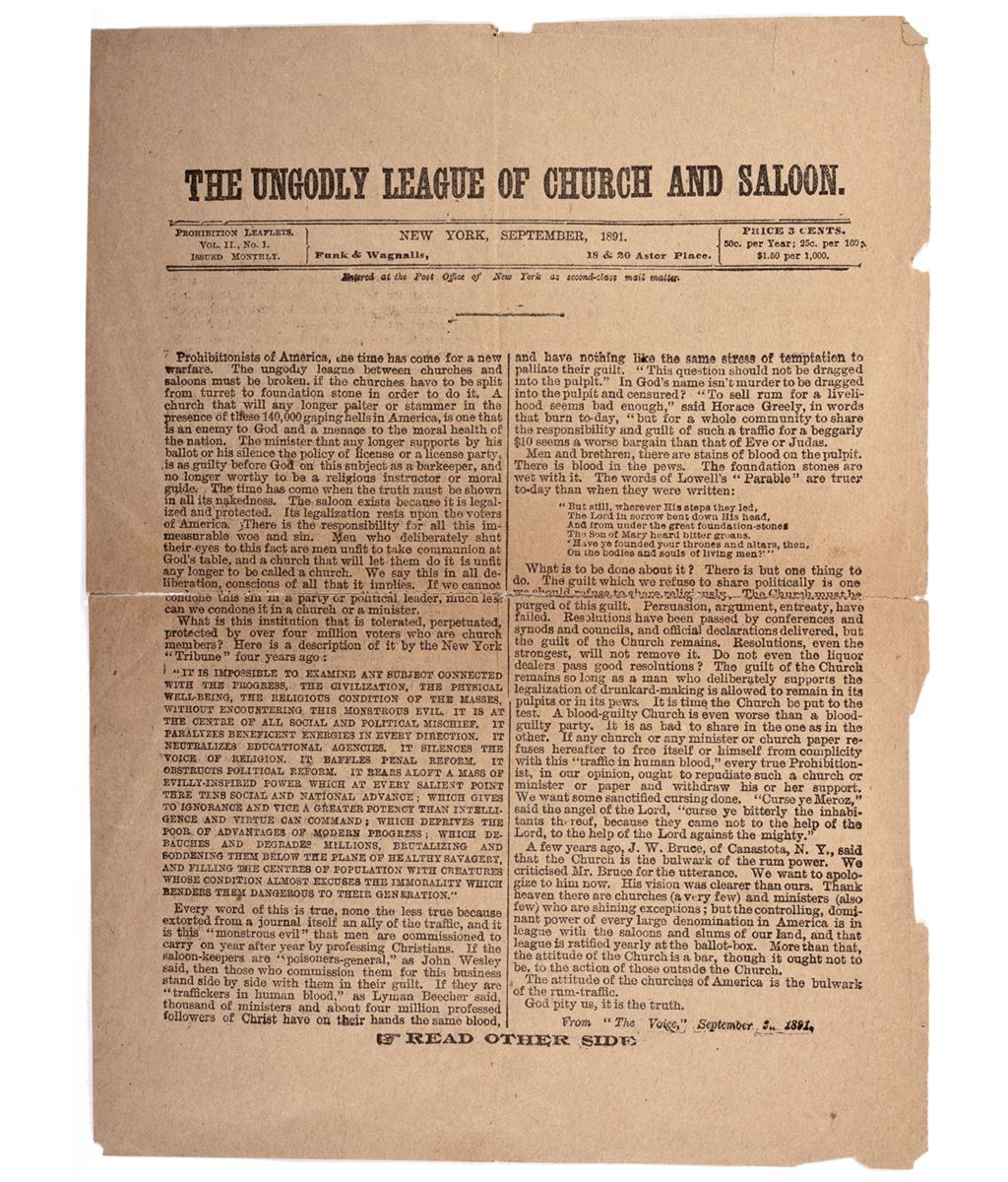 Measures 10.25” x 7.5”, some wear, including crease and tears along the sides and in the middle. The leaflet promotes two sermons; “The Ungodly League of Church and Saloon” and "Touch Not the Unclean Thing.” Both taken from The Voice. Produced in New York, September 1891. A section from one of the passages reads: “a church that will not insist that its members array themselves against that license of drunkard-making and against all political parties that uphold it has lost it s power to cope with sin and has become an ally of hell.” The topic of temperance and alcohol consumption has a long and complex history in the United States. By the time this leaflet was produced, many groups banded together to campaign against businesses that supported the making or selling of alcohol. The list included the American Temperance Society, Prohibition Party, the Woman`s Christian Temperance Union and many others. Religious leaders and other temperance groups wrote and produced leaflets to help gain support in banning alcohol. This leaflet is one of many made, meant to gain support for the cause [Ref: American Temperance Movement, Jack S. Blocker, 1989, pp. 13-26].City: County: State: