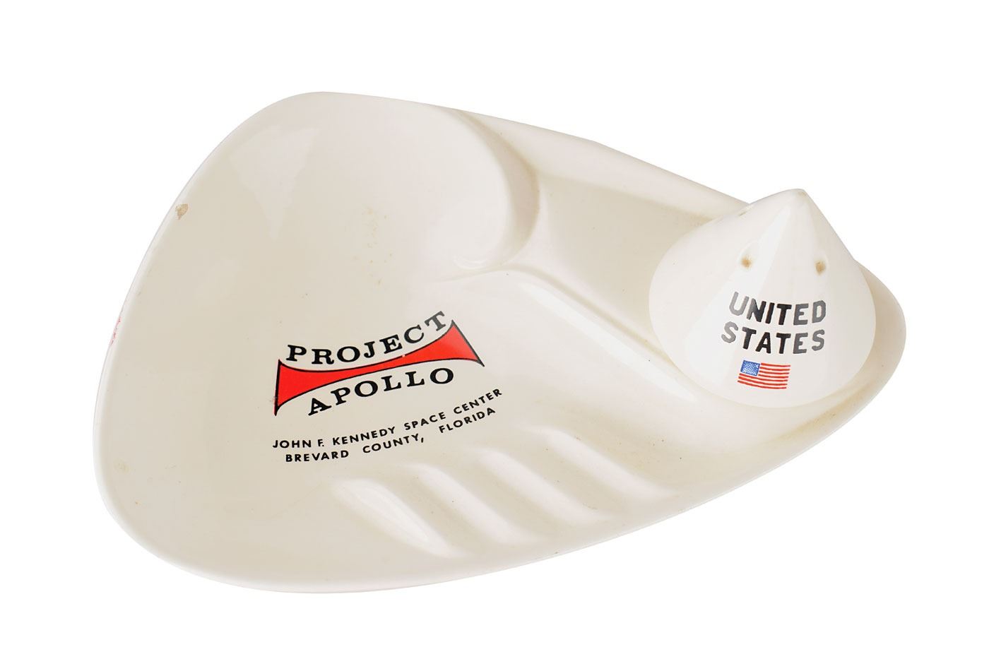 Two matching vintage Project Apollo table pieces: a mug designed in the form of a Command Module, with a "Project Apollo" logo on one side; and an ashtray featuring a three-dimensional Command Module sculptural element, featuring a large "Project Apollo" logo in the bottom. In overall fine condition, with some light soiling.