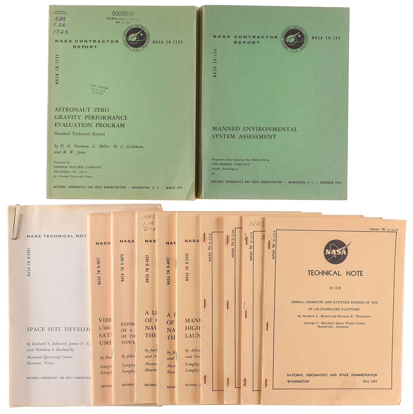 Group lot of 11 NASA Technical Note booklets and two NASA Contractor Reports, dating between 1962 and 1971. The NASA Technical Note booklets include the following titles (includes duplicates and one copy): “Gimbal Geometry and Attitude Sensing of the ST-124 Stabilized Platform,” dated May 1962 (2); “Servo Loop Design for Air Bearing Inertial Components,” dated May 1962; “Saturn Vehicle Attitude Resolver Computer Error Analysis,” dated September 1962; “Space Suit Development Status,” dated February 1966 (copy); “Manual Control of High-Altitude Apollo Launch Abort,” dated June 1966 (2); “A Linearized Error Analysis of Onboard Primary Navigation Systems for the Apollo Lunar Module,” dated August 1967 (2); “Experimental Vibration Characteristics of a 1/40–Scale Dynamic Model of the Saturn V—Launch-Umbilical Tower Configuration,” dated November 1968; and “Vibration Analysis of a 1/40–Scale Dynamic Model of Saturn V—Launch-Platform— Umbilical-Tower Configuration,” dated November 1968.” The NASA Contractor Reports are as follows: “Manned Environmental System Assessment,” (NASA CR-134), dated November 1964; and “Astronaut Zero Gravity Performance Evaluation Program: Detailed Technical Report,” (NASA CR-1725), dated March 1971. Some booklets feature annotations, library stamps, and address labels. In overall very good to fine condition, with some scattered stains and creases.