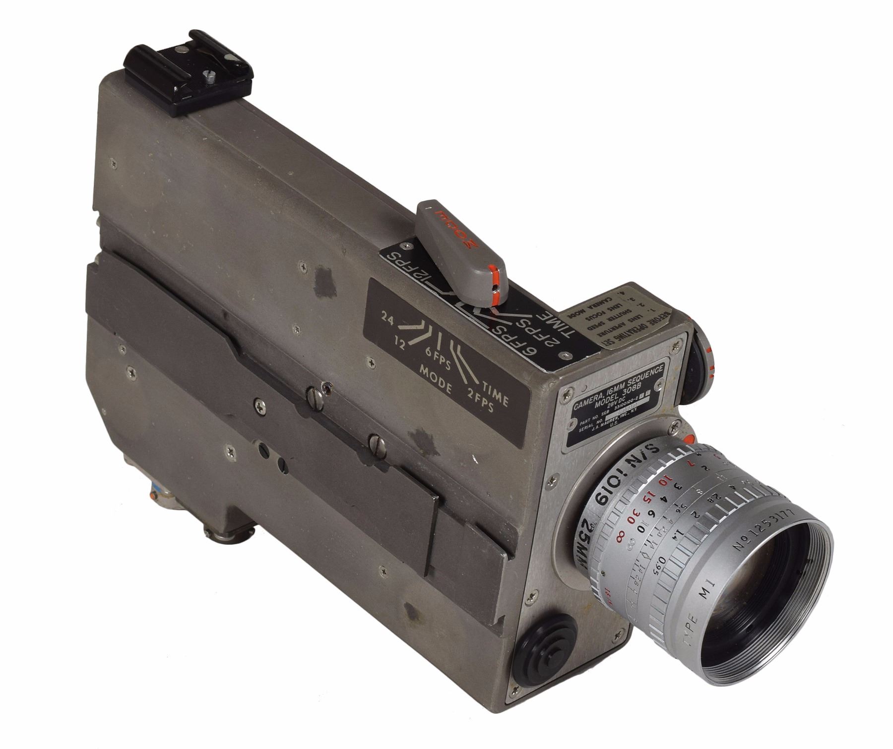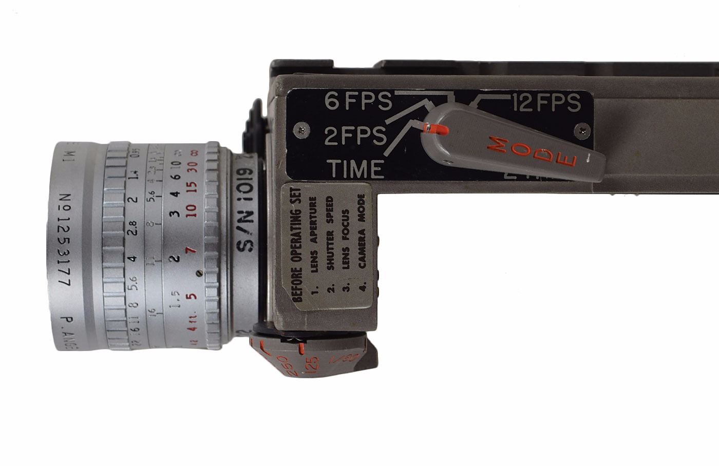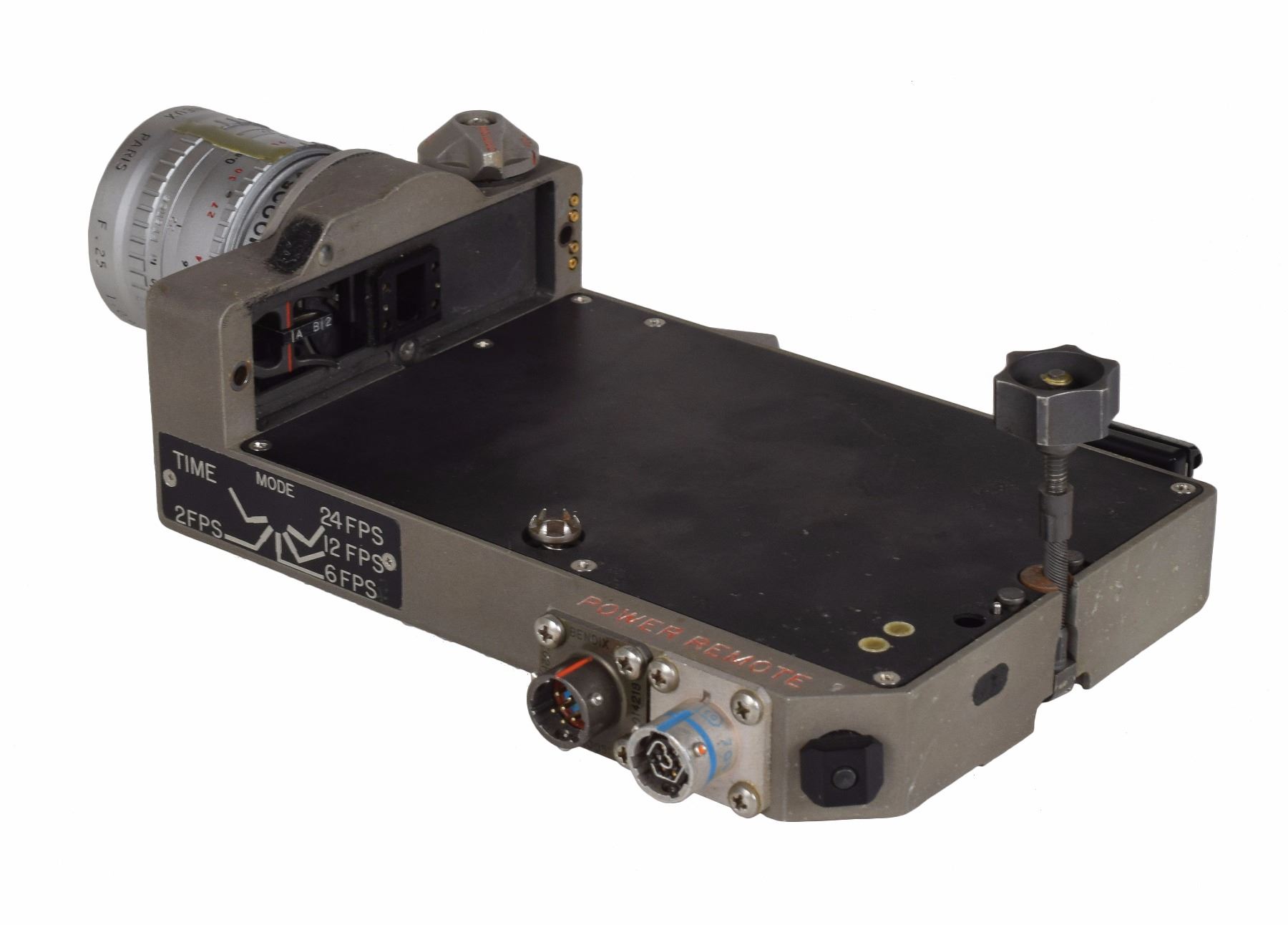 Designed and manufactured by J. A. Maurer of Long Island, New York, the Maurer Data Acquisition Camera was used to obtain sequential photographic data during the manned flights of Project Apollo and Skylab. It was capable of using the standard 16mm film format with double perforations and, in addition to the captured images, recorded fiducial marks on the film for data reduction use following the return from the mission. The camera’s unique design incorporates completely independent shutter speeds and frame rates (unlike a conventional commercial movie camera). It was designed to be handheld (i.e. during EVA) or bracket-mounted in the spacecraft, and powered either by the spacecraft’s 28-volt DC power or from a portable battery pack. It accepts various lenses and assorted accessories, and the 25mm Angenieux lens was generally relegated as secondary in preference of the 18mm Kern Switar lens.