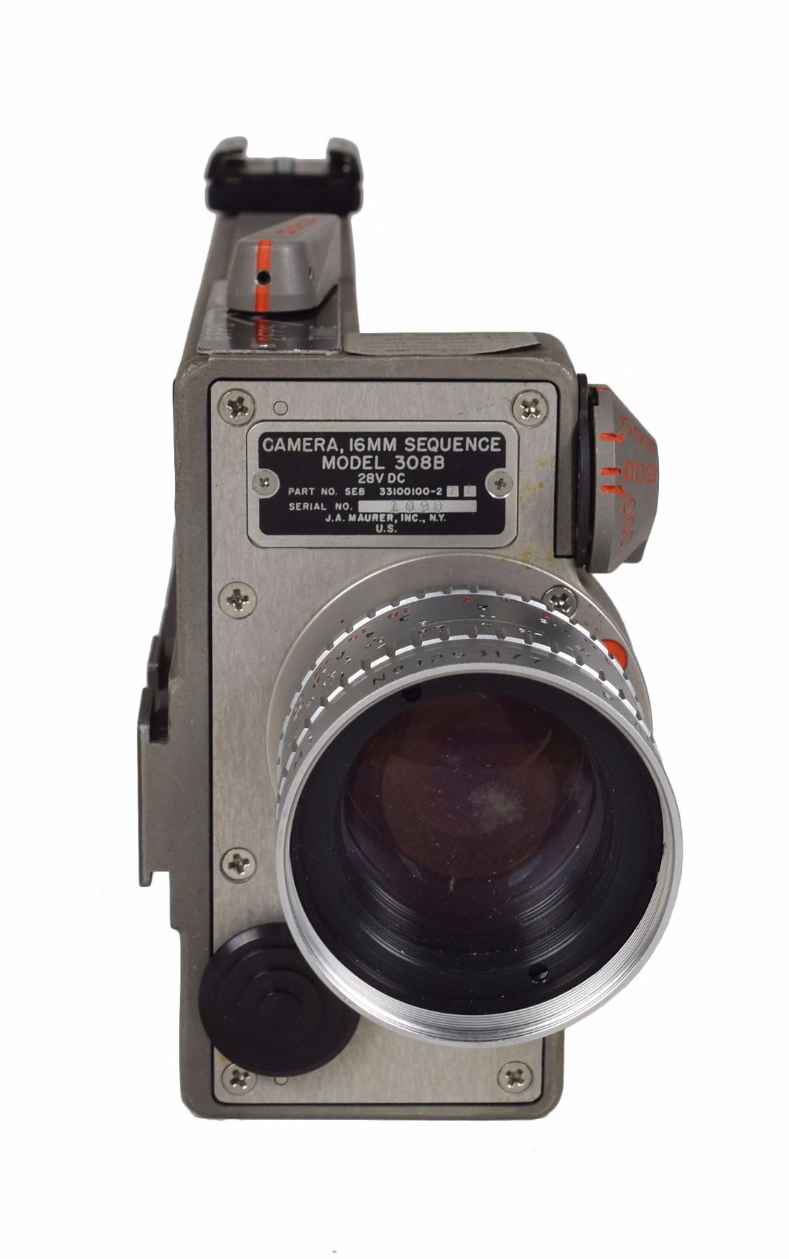Extremely rare flight qualified Apollo/Skylab Series 308 Maurer Data Acquisition Camera, measuring approximately 6 x 3.75 x 2.5, with a part ID plate on the front reading: “Camera, 16MM Sequence, Model 308B, 28V DC, Part No. SEB 33100100-211, Serial No. 1090, J. A. Maurer, Inc., N. Y., U. S.” Includes a 25mm Angenieux Paris Type M1 lens marked with NASA part numbers, “SEB 33100054-202, S/N 1019,” with an aperture range of f/0.95 to f/25. In fine condition.