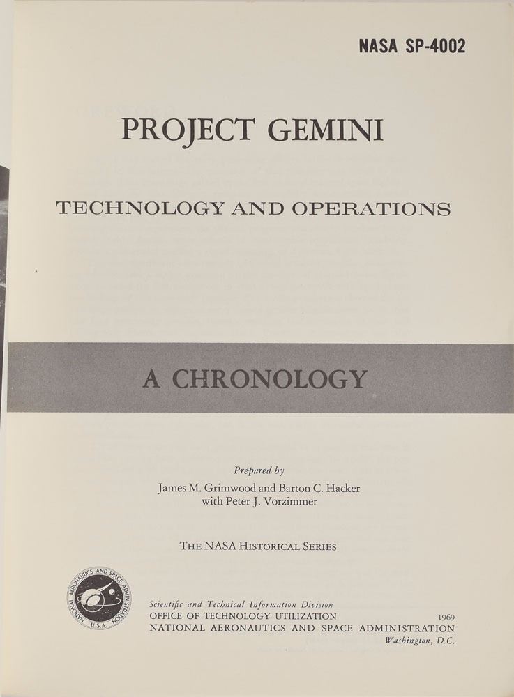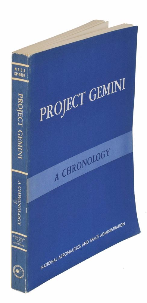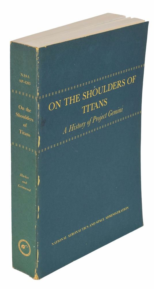 Two uncommon softcover books: On the Shoulders of Titans: A History of Project Gemini, 6.75 x 9.75, 625 pages, published by NASA in 1977; and Project Gemini: Technology and Operations, A Chronology, 7.75 x 10.25, 308 pages, published by NASA in 1969 as part of their Historical Series. Both volumes were prepared by Barton C. Hacker and James M. Grimwood. In overall very good to fine condition, with a few creases to back cover and pages of Project Gemini, slight wear and rubbing to spines of each, with Project Gemini spine also bearing a small dent.