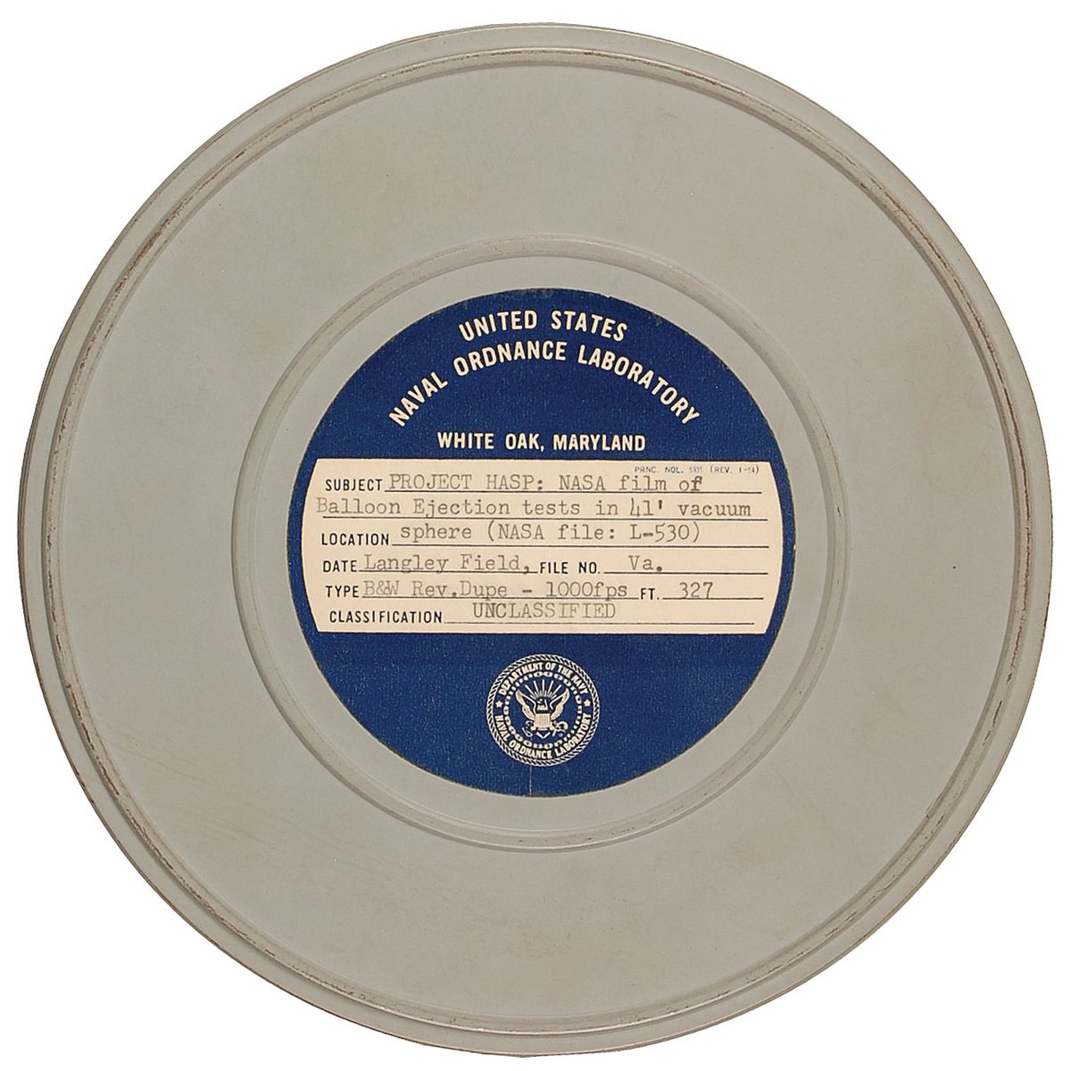 Original 16mm unclassified film from the United States Naval Ordnance Laboratory of a Project Hasp Test. Film is housed in a 7-inch diameter canister, with a label on the cover reading, “Project Hasp: NASA film of Balloon Ejection tests in 41´ vacuum sphere…Langley Field, Va., B&W Rev. Dupe—1000 fps; Ft. 327; Unclassified.” A handwritten label on the reel reads, “Hasp–Robin Ejection Tests—NASA, Langley Field, Va., Feb 60.” In fine condition.