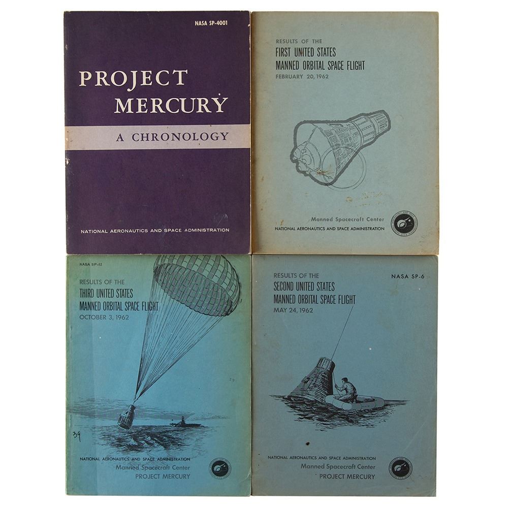 Group of four official softcover reports published by NASA's Manned Spacecraft Center, chronicling the beginnings of Project Mercury‰ÛÓAmerica's first journeys into space. Includes: Results of the First United States Manned Orbital Space Flight, February 20, 1962; Results of the Second United States Manned Orbital Space Flight, May 24, 1962 (NASA SP-6); Results of the Third United States Manned Orbital Space Flight, October 3, 1962 (NASA SP-12); and Project Mercury: A Chronology (NASA SP-4001). In overall very good condition, with staining and pencil marks to covers of the first report, tape repair to spine of the third report, and some scuffs and surface wear to covers of the last report; internal pages are generally fine.