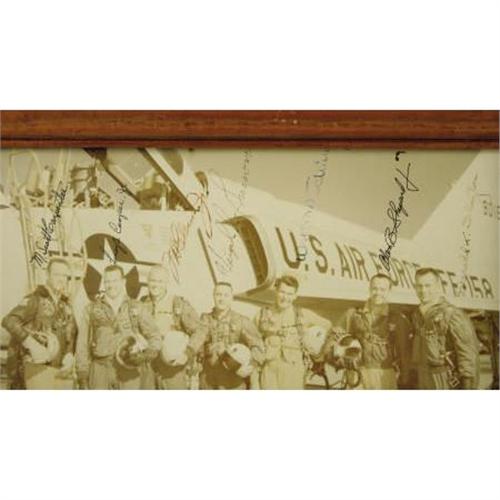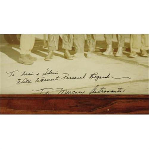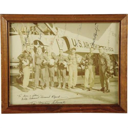 <B>Project Mercury Astronauts Large Signed Color Photograph Taken the Day JFK was Inaugurated,</B></I> 12.5" x 9.5" (visible), framed to 14.5" x 11.5". Signed "<I>M. Scott Carpenter,</B></I>" "<I>Leroy G. Cooper, Jr.</B></I>" "<I>J.H. Glenn Jr.,</B></I>" "<I>Virgil I. Grissom,</B></I>" "<I>Walter M. Schirra, Jr.,</B></I>" "<I>Alan B. Shepard Jr.,</B></I>" and "<I>Donald K. Slayton.</B></I>" The photo is faded, removing most of the color, as are, partially, Schirra and Slayton's signatures. Surface cracks do not materially affect the photo's appearance. Inscribed in an unknown hand at the bottom "<I>To Terri & Sheri/ With Warmest Personal Regards/ The Mercury Astronauts.</B></I>" The seven Project Mercury astronauts are standing beside a Convair 106-B aircraft at Langley Air Force Base, Virginia, in their flight suits. On the day this photograph was taken, January 20, 1961, John F. Kennedy was inaugurated the 35th President of the United States in Washington, D.C. Signed with their rare, desirable, early signatures. Carpenter soon dropped the "<I>M.</B></I>" from his signature, Cooper dropped "<I>Leroy G.</B></I>" for "Gordon," Slayton changed "<I>Donald K.</B></I>" to "D.K.," Grissom signed "Gus" instead of "<I>Virgil I.,</B></I>", and Schirra signed "W.M." instead of "<I>Walter M.</B></I>" <I>From the collection of renowned former physical trainer of the astronauts Joe Garino. This lot is accompanied by a signed certificate of authentication from Garino verifying its provenance.</B></I><BR><BR><b>Shipping:</b> Framed - with Glass, Small (<a target="_blank" href="http://www.heritageauctions.com/common/shipping.php">view shipping information</a>)