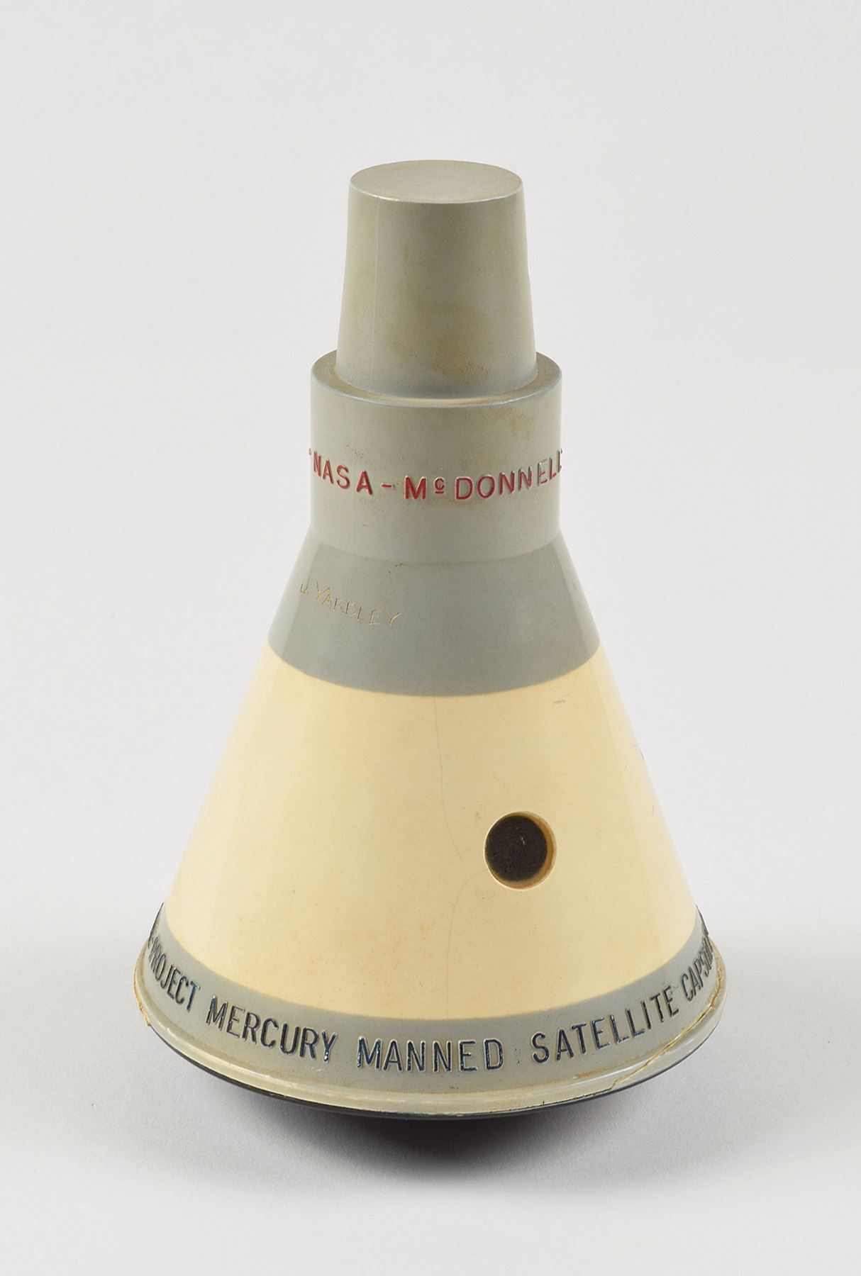 Vintage NASA–McDonnell contractor's model of a Mercury capsule, standing 6? tall and 3.75? in diameter, with raised text running along bottom: "Project Mercury Manned Satellite Capsule." In very good condition, with light scattered soiling and a repaired crack along the rim of the weighted base.