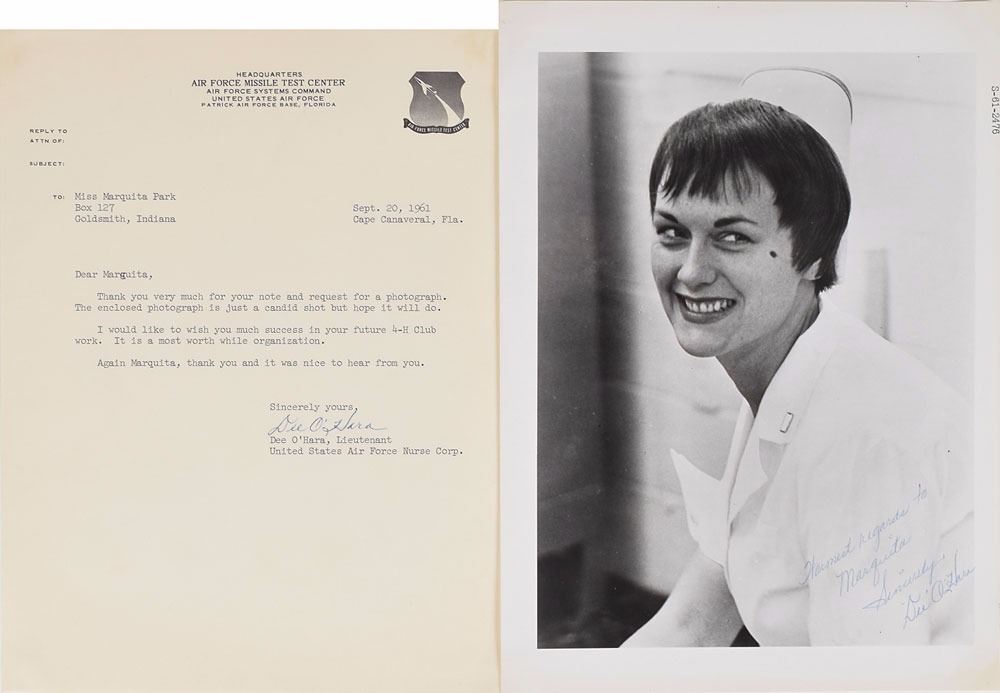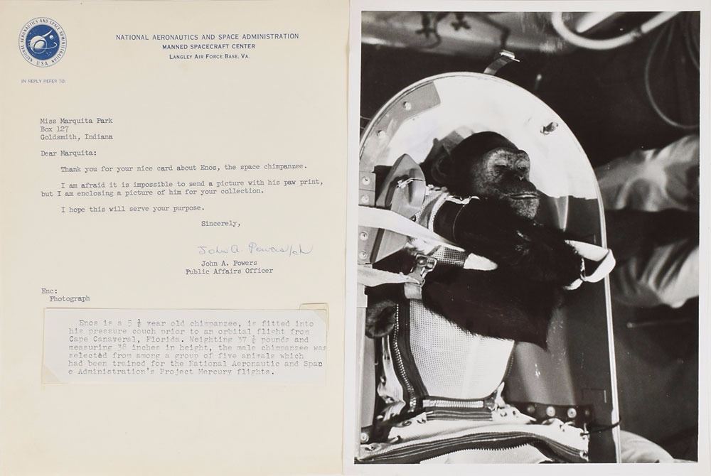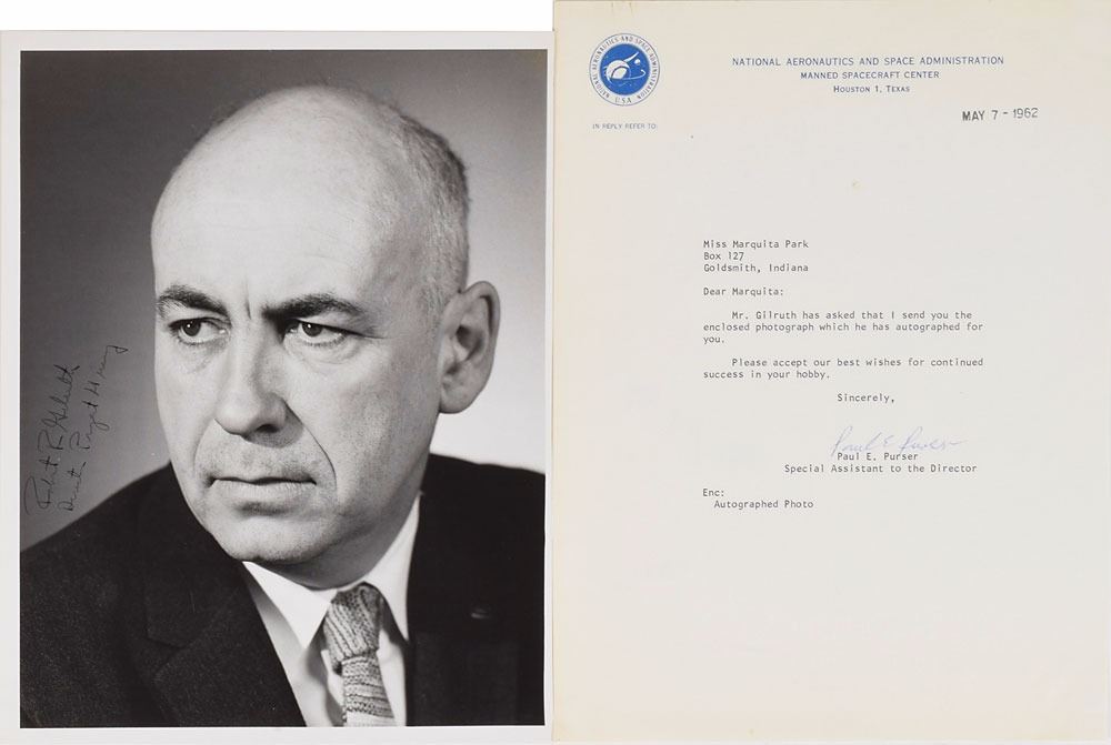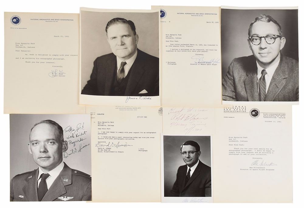 Collection of more than 20 items signed by notable NASA personnel involved in Project Mercury, plus two X-15 pilots, sent to Marquita Park in the early 1960s, consisting of signed photos, letters, and signatures, several inscribed, including: Chris Kraft (SP), Robert Gilruth (SP, with transmittal letter from Paul E. Purser), Dee O'Hara (SP and TLS), Robert B. Voas (signature), David G. Simons (TLS and SP), Abe Silverstein (TLS and SP), James E. Webb (SP, with transmittal letter from an assistant), D. Brainerd Holmes (TLS and unsigned photo), Krafft A. Ehricke (SP), John P. Stapp (TLS and signature), Stanley White (SP, with transmittal letter from Public Affairs Officer John A. Powers), John A. 'Shorty' Powers (SP, with secretarial transmittal letter), Frank A. Erwin (SP and TLS), Mrs. Leroy G. Cooper, Jr. (TLS), Edward J. Murray (SP), Harold Brown (SP), Scott Crossfield (signature), and Robert Rushworth (SP). Also includes an unsigned photo of "Enos, the space chimpanzee." In overall very good to fine condition. These remarkable behind-the-scenes personnel—including administrators, engineers, nurses, flight directors, and more—are the people that truly made the success of Project Mercury possible. A superb, early collection of the personalities that formed the foundation of the American space program.
