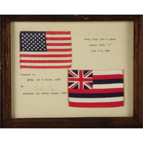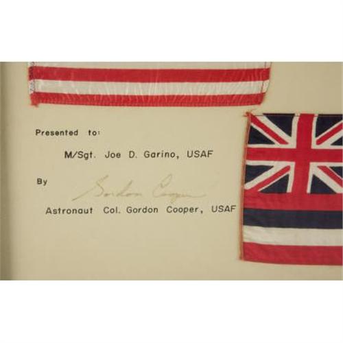 <B>Project Mercury Flown U.S. and Hawaii Flags.</B></I> 5.75" x 4" U.S. flag and 6.25" x 4" Hawaii state flag affixed to 13.25" x 10.25" board upon which has been neatly penned: "<I>These flags flew in space/ aboard Faith '7'/ June 3-5, 1965</B></I>" and "<I>Presented to:/ MSgt. Joe D. Garino, USAF/ By/ Astronaut Col. Gordon Cooper, USAF,</B></I>" signed in ink "<I>Gordon Cooper.</B></I>" Signature a bit light. The date is wrong; it should be "May 15-16, 1963." Cooper attended the University of Hawaii and presented this to Garino whose home state was Hawaii. He had set an endurance record on this mission by logging 34 hours in space, more than all five previous Mercury astronauts combined! Framed to 17" x 14". Flags flown in space during Project Mercury are rare and extremely desirable. Accompanied by a one page, 8" x 10.5", Typed Letter Signed "<I>Gordon Cooper,</B></I>" to Joe Garino, stating "<I>This American and Hawaiian flag flew aboard Mercury Atlas 'Faith VII'…</B></I>" <I>From the collection of renowned former physical trainer of the astronauts Joe Garino. This lot is accompanied by a signed certificate of authentication from Garino verifying its provenance.</B></I><BR><BR><b>Shipping:</b> Framed - with Glass, Small (<a target="_blank" href="http://www.heritageauctions.com/common/shipping.php">view shipping information</a>)