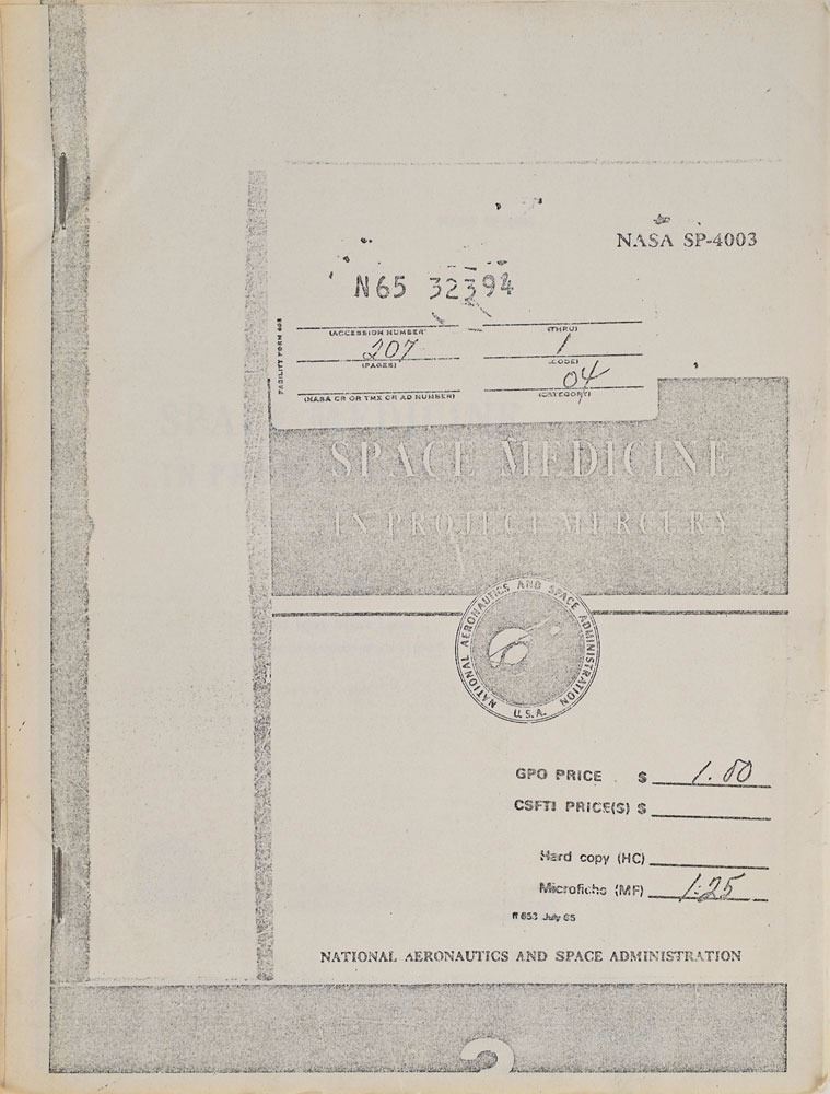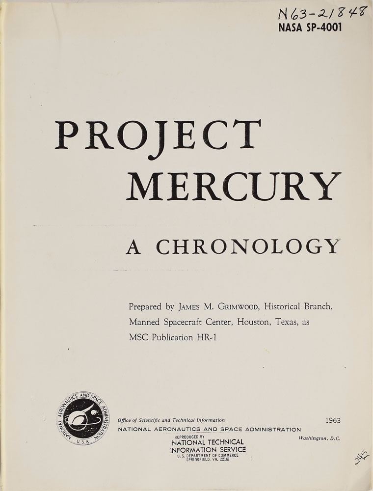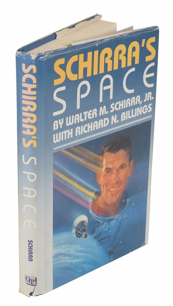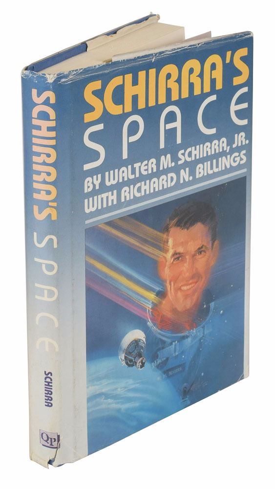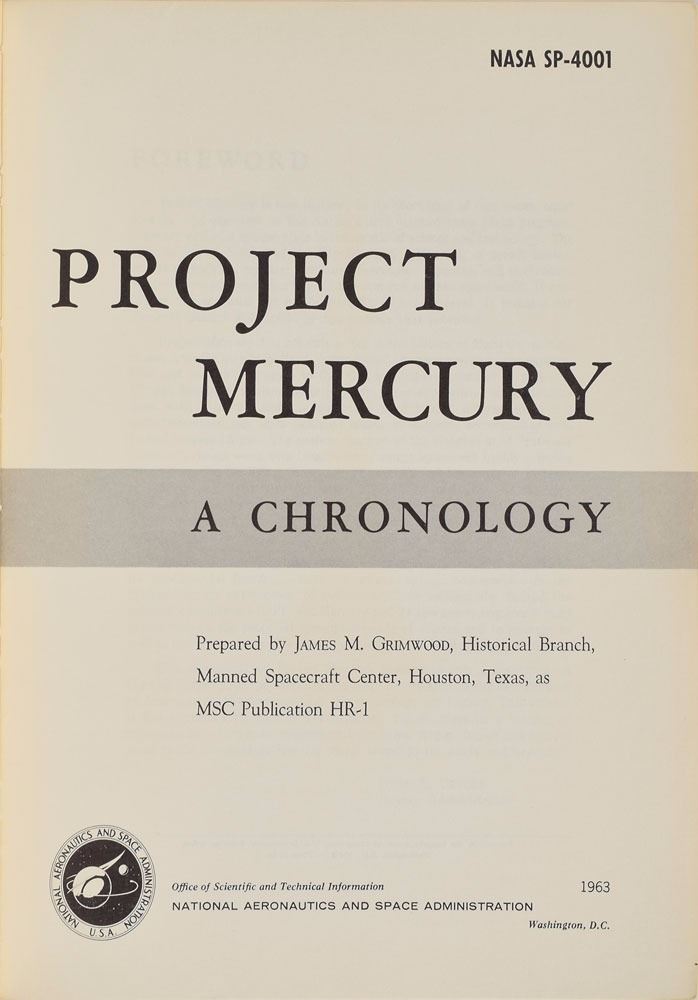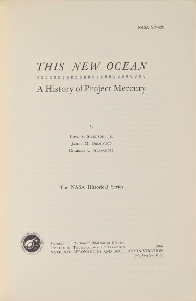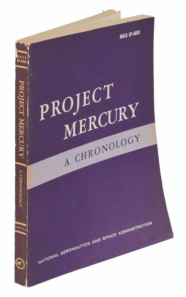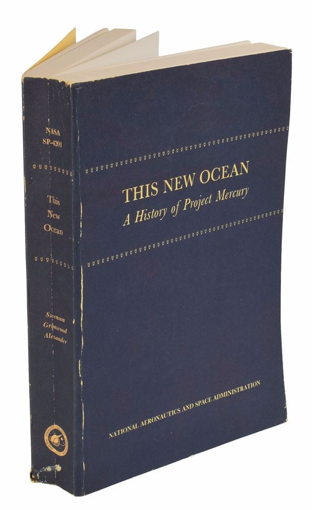Group of six Mercury-related books, including two uncommon official NASA softcover books: This New Ocean: A History of Project Mercury, 6.75 x 9.75, 681 pages, published by NASA in 1966 as part of their Historical Series; and Project Mercury: A Chronology, NASA SP–4001, 7.75 x 10.25, 238 pages, published by NASA in 1963. In overall very good to fine condition, with noticeable wear and chipping to both spines, with some sunning to the Project Mercury book, and some slight creasing to covers of This New Ocean. Also includes a first edition of Schirra's Space, hardcover with dust jacket, signed and inscribed on the half-title page in black felt tip, "To Tami—Wally Schirra"; a copy of Starfall by Betty Grissom, hardcover with dust jacket; a staple-bound copy of a manual entitled "Space Medicine in Project Mercury," NASA SP–4003; and a wax-bound copy of Project Mercury: A Chronology, NASA SP–4001.