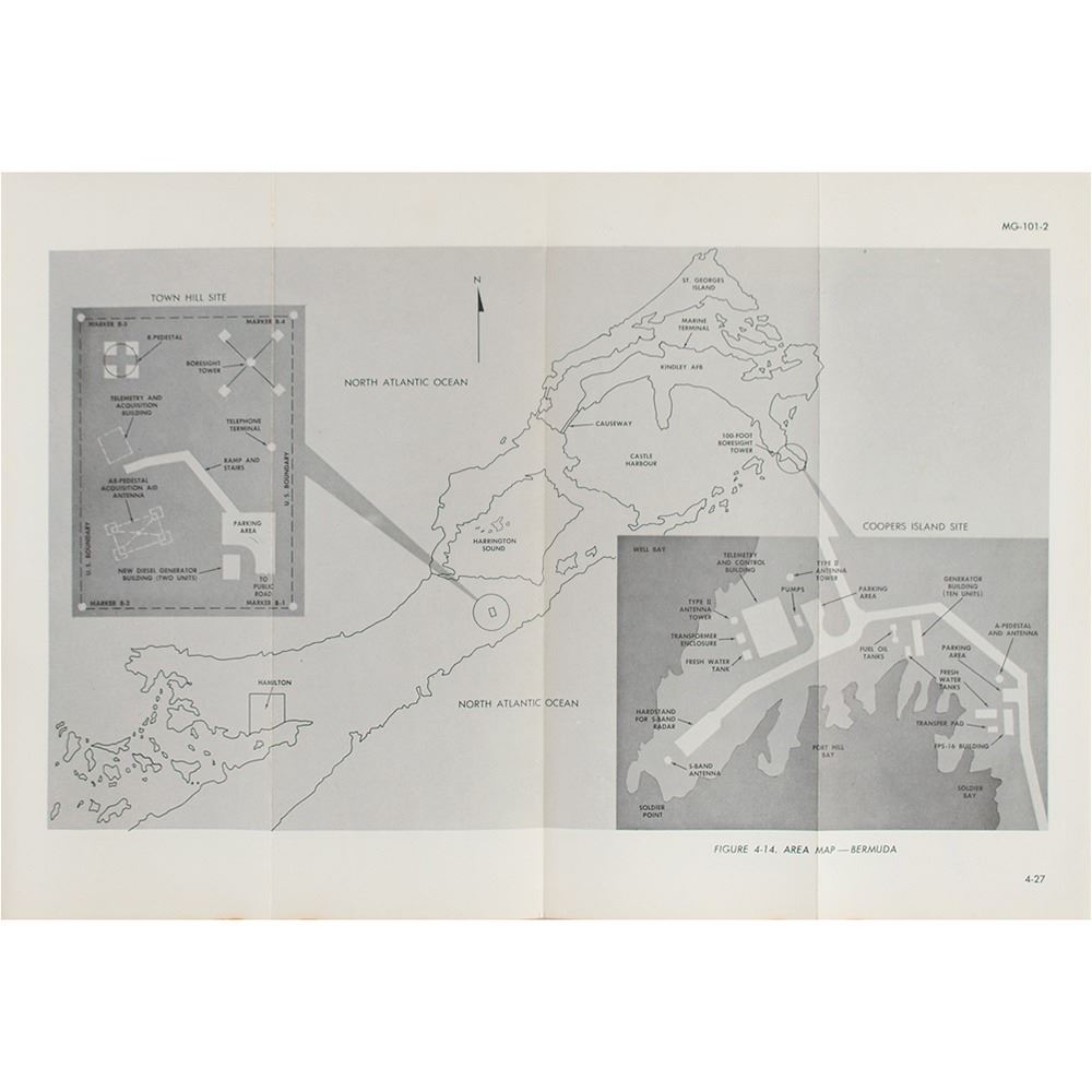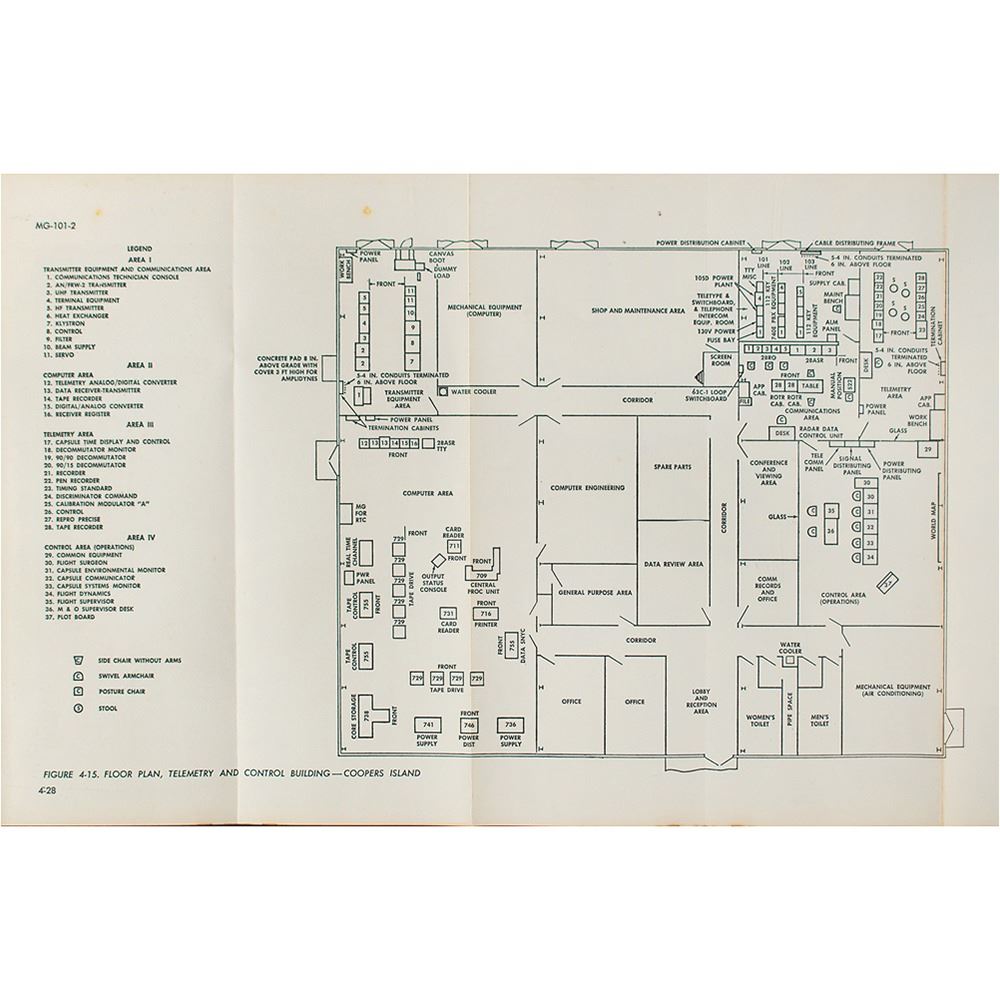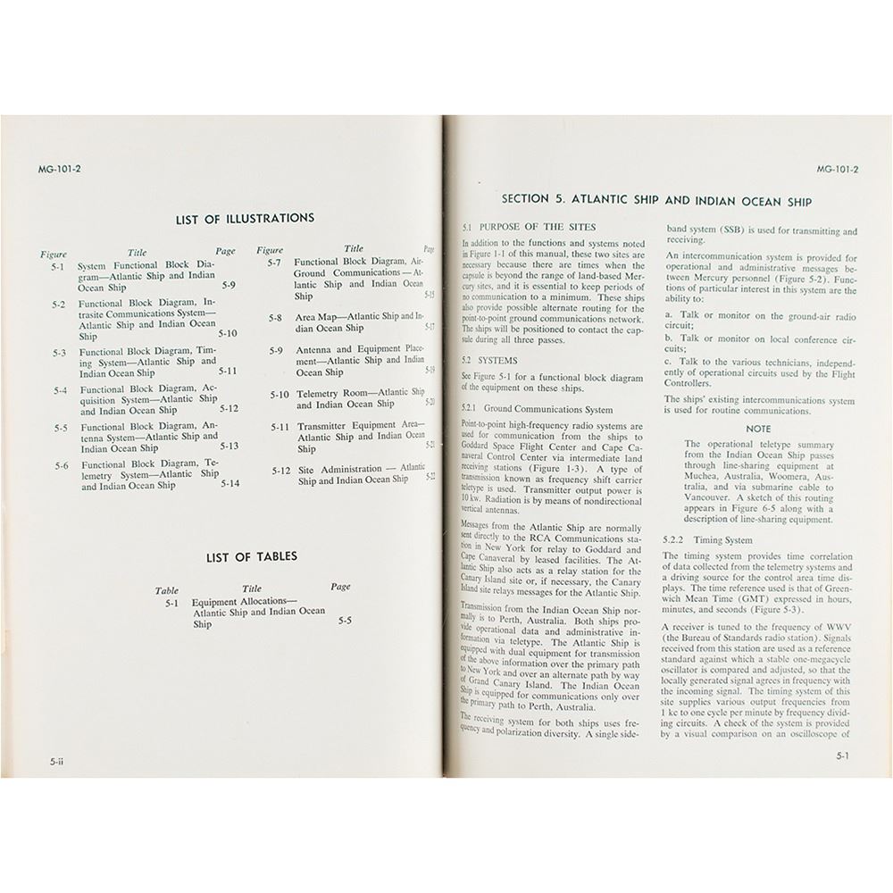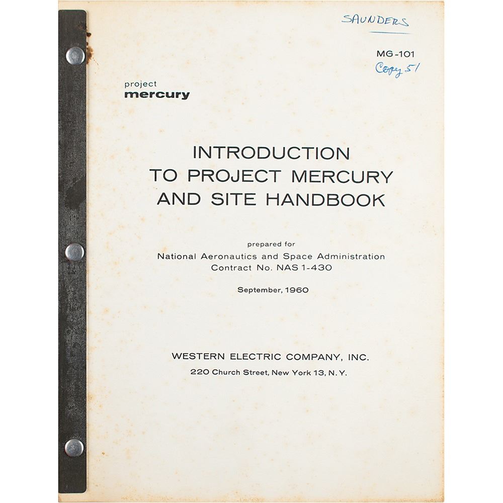 Limited-distribution bracket-bound "Introduction to Project Mercury and Site Handbook," MG-101, prepared for NASA by the Western Electric Company, dated September 1960, approximately 275 pages, 9 x 11.25, marked on the title page in ink, "Saunders, Copy 51." This manual presents a brief explanation of the objectives of the mission, followed by a comprehensive overview of the functions, equipment, facilities, and environment of ground tracking stations around the globe. Includes many fold-out functional block diagrams, simplified schematics, charts, and maps showing the interrelationship and locations of the systems at each site, as well as its administrative organization. Housed in its original orange binder. In overall very good to fine condition, with scattered foxing to interior, and some staining to the fore edges.